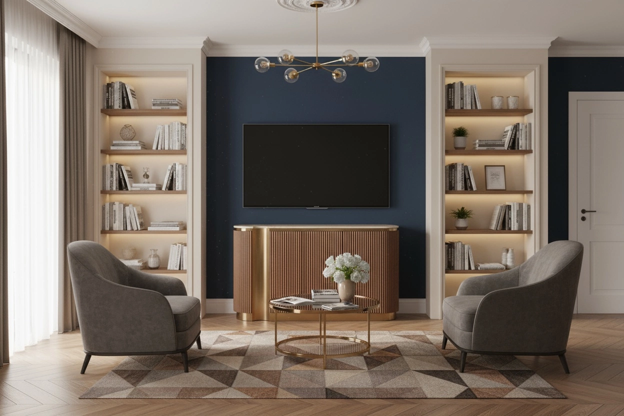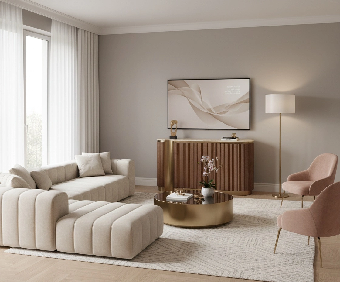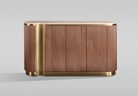 Komoda utrzymana jest w eleganckim połączeniu kolorystycznym: orzech włoski na frontach, złoty wieniec dolny oraz subtelne akcenty, a całość wieńczy jasnobeżowy blat w półmacie, który nadaje meblowi lekkości i nowoczesnego charakteru. Ryflowane drewno na drzwiach oraz zastosowanie naturalnego kamienia trawertynu dodatkowo podkreślają wyjątkowy styl i klasę tego modelu. To idealny wybór dla osób ceniących wyrafinowane i prestiżowe rozwiązania.