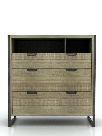 Model FLOB03 wyróżnia się nowoczesnym, minimalistycznym designem w kolorze piaskowym, który doskonale współgra z grafitowymi nogami. Taki kontrast nadaje meblowi lekkości i charakteru, wpisując się w najnowsze trendy wnętrzarskie. Komoda Flow wyposażona jest w cztery pojemne szuflady oraz dwie praktyczne półki, które umożliwiają wygodne przechowywanie różnorodnych przedmiotów. System soft close oraz metalowe prowadnice gwarantują ciche i płynne zamykanie szuflad, podnosząc komfort użytkowania.