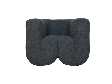 Fotel tapicerowany został pokryty tkaniną szenilową supełkową o niejednolitej, asymetrycznej strukturze, która nadaje mu niepowtarzalny charakter. Kombinacja melanżowego ciemnoszarego z czarnym kolorem tkaniny sprawia, że mebel jest odporny na zabrudzenia, a jednocześnie zachowuje swoją świeżość i elegancję przez długi czas. Tkanina szenilowa to także gwarancja miękkości w dotyku i wygody podczas wielogodzinnego siedzenia.