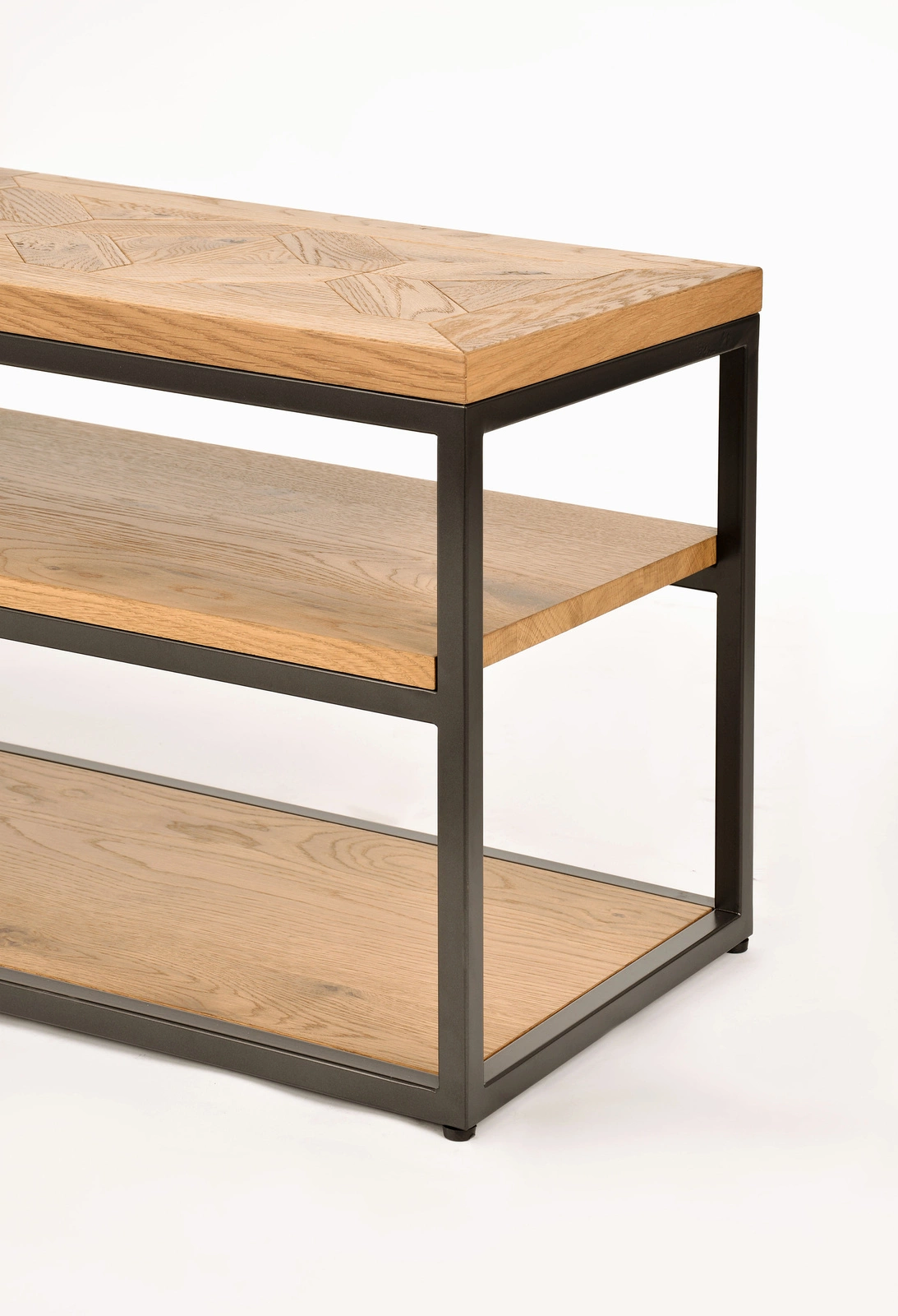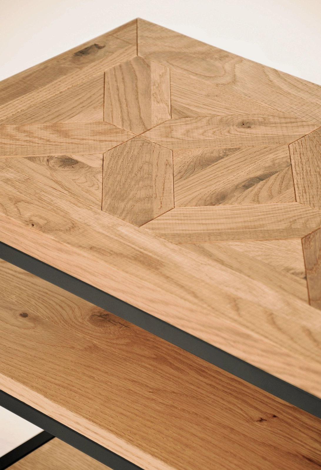 Wykonana z wysokiej jakości drewna dębu komoda Indus IN25-0 zachwyca swoim naturalnym, ciepłym kolorem, który wprowadza do wnętrza przytulną atmosferę. Blat z intarsją to nie tylko estetyczny detal, ale także element podkreślający unikatowość mebla. Ciemnografitowe metalowe nogi dodają całości nowoczesnego, industrialnego charakteru, który doskonale komponuje się zarówno z klasycznymi, jak i loftowymi aranżacjami.