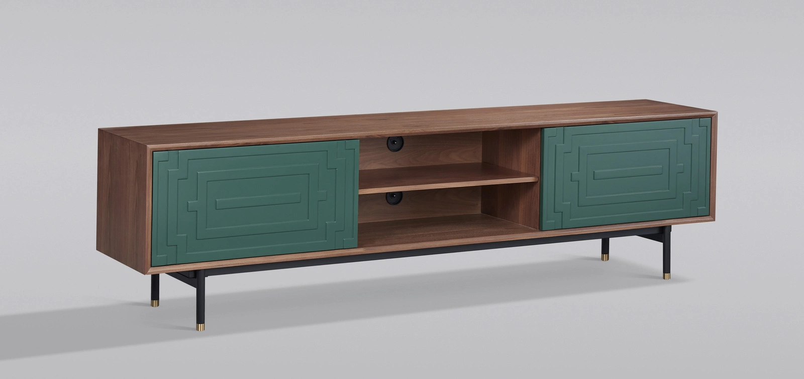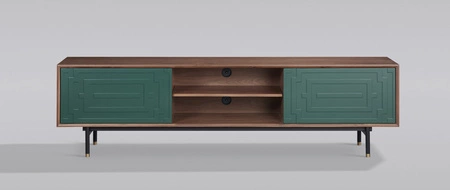 Szafka wykonana jest z MDF pokrytego elegancką okleiną z orzecha włoskiego, która nadaje meblowi naturalny i ciepły wygląd. Połączenie frontów w modnym kolorze miętowej zieleni oraz solidnych, czarnych nóg metalowych podkreśla jej nowoczesny charakter. Dzięki temu komoda RTV Stilig ST153 doskonale wpisze się zarówno w klasyczne, jak i bardziej awangardowe wnętrza. Mebel o wymiarach 200 cm szerokości, 40 cm głębokości i 55 cm wysokości stanowi wygodną oraz estetyczną przestrzeń do przechowywania.