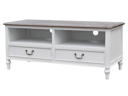 Komoda posiada dwie pojemne szuflady oraz dwie praktyczne półki, które umożliwiają wygodne przechowywanie pilotów, dokumentów, akcesoriów RTV lub innych drobiazgów. Metalowe uchwyty dodają meblowi nowoczesnego charakteru, a uchwyty zostały zaprojektowane tak, aby zapewnić łatwy i płynny dostęp do zawartości szuflad.