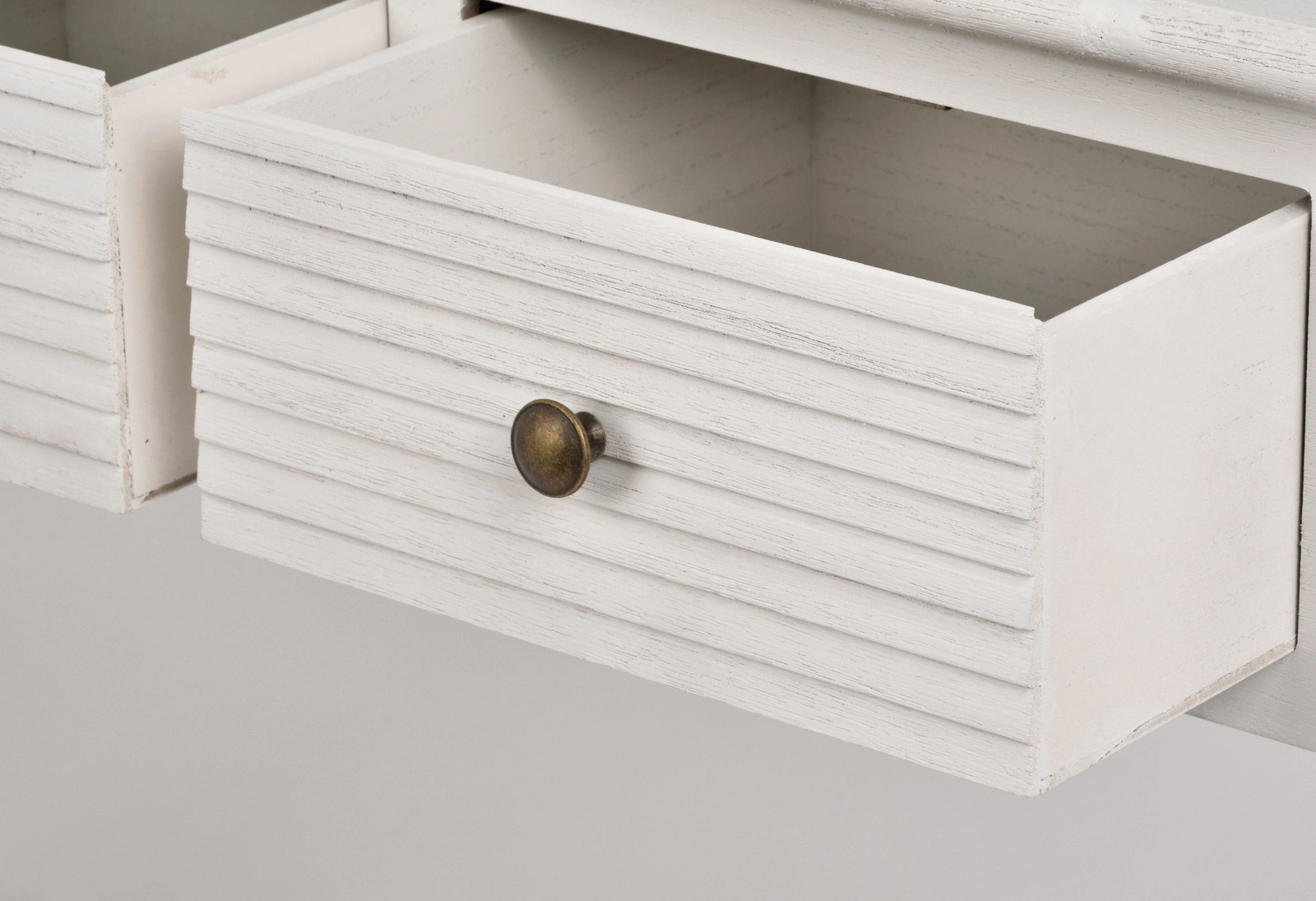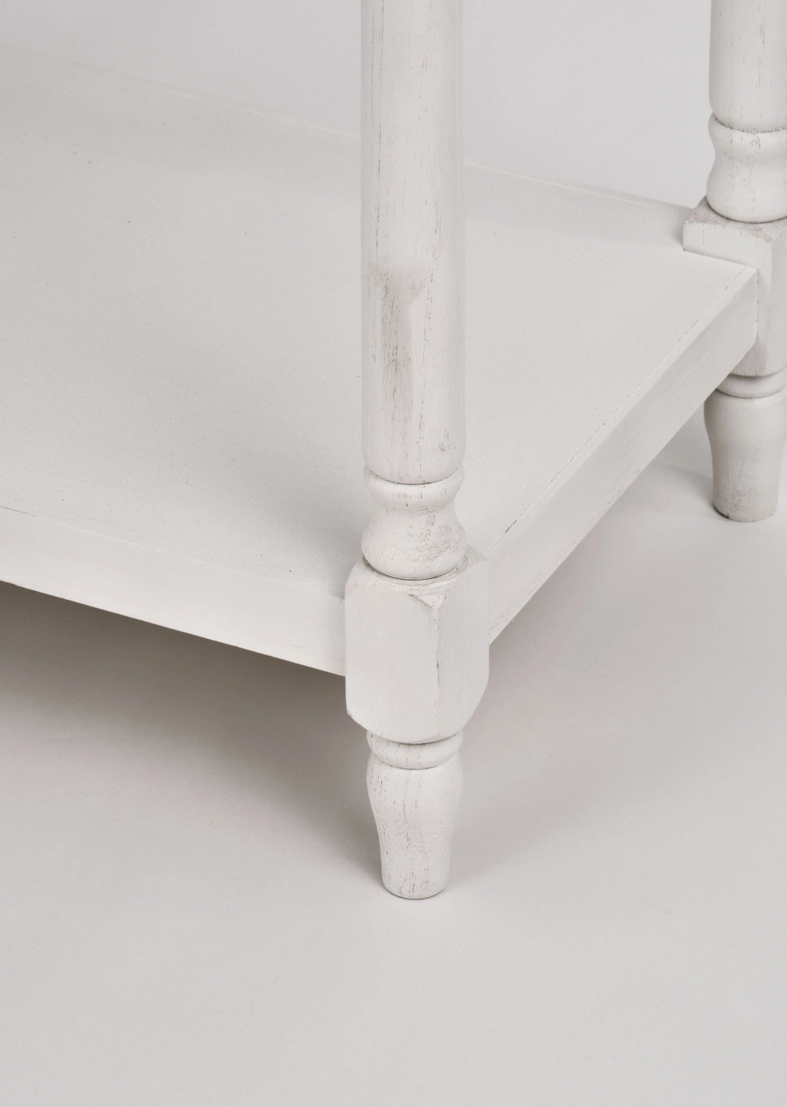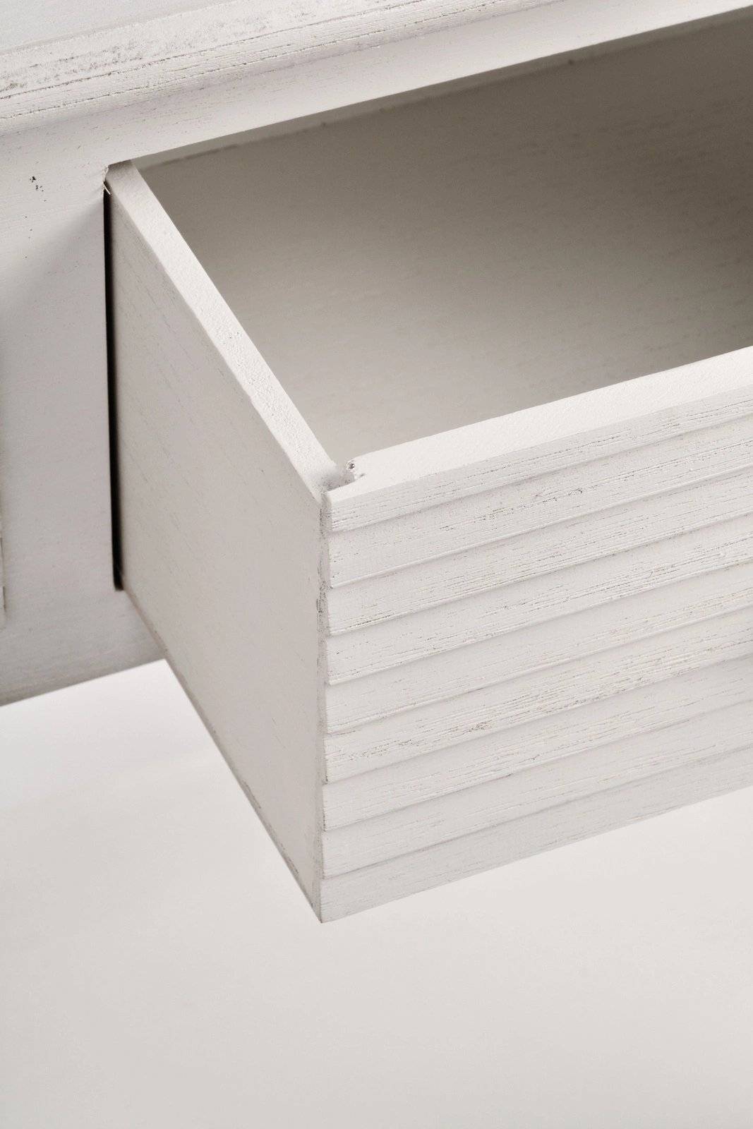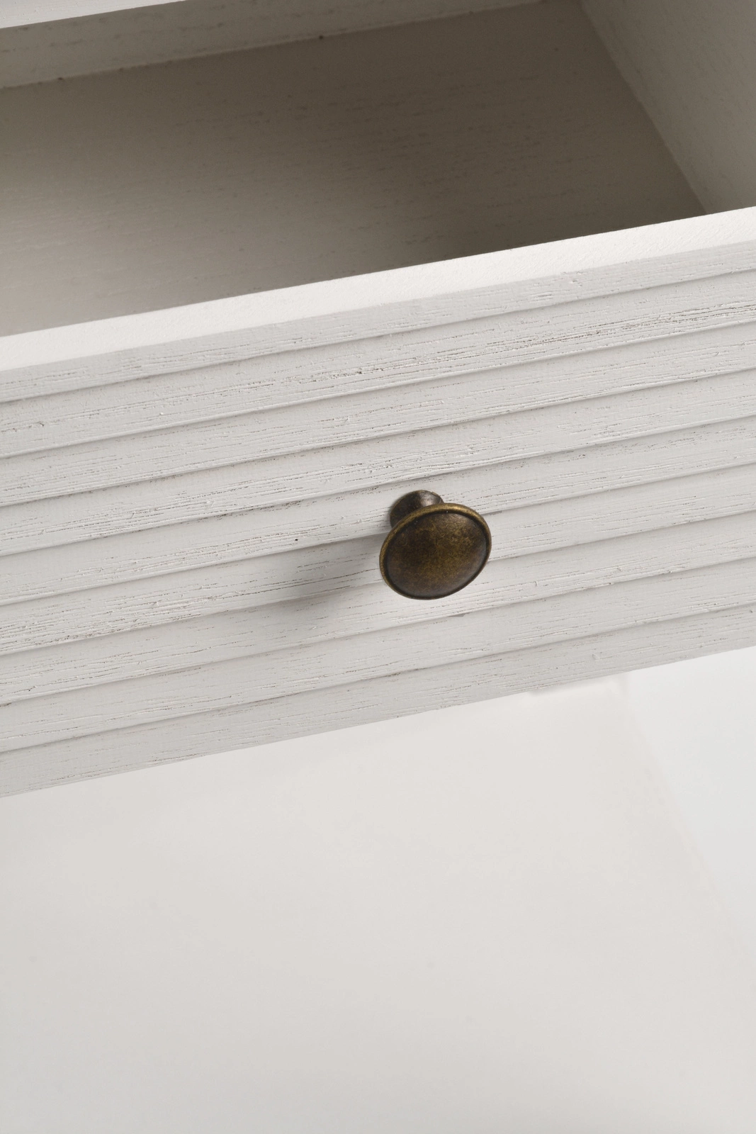 Konsola Livorno została wykonana z połączenia naturalnego drewna paulowni oraz MDF, co gwarantuje trwałość i solidność konstrukcji. Jej powierzchnia pokryta jest białym wykończeniem z efektownymi przetarciami w stylu shabby chic, co nadaje meblowi rustykalnego uroku i podkreśla widoczną strukturę drewna. Metalowe uchwyty oraz drewniane prowadnice szuflad dopełniają całości, zapewniając jednocześnie wygodę użytkowania i wytrzymałość.