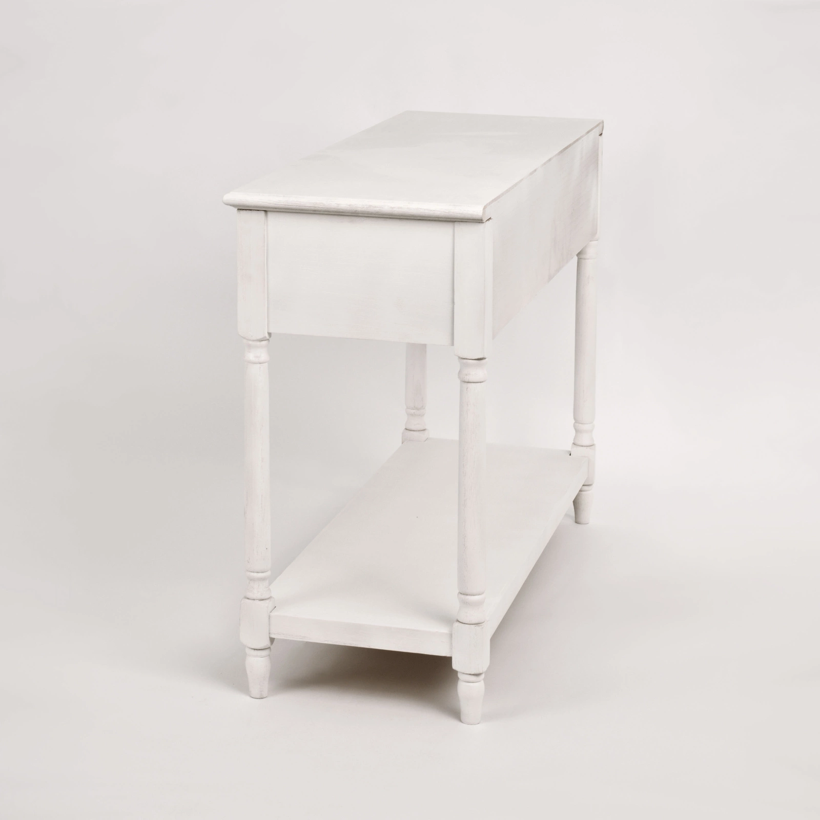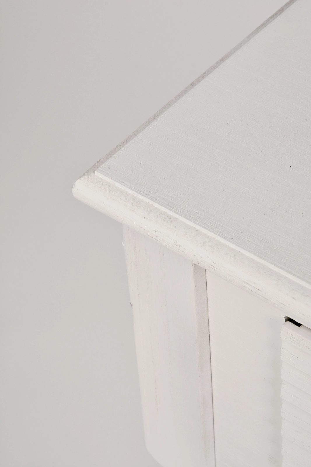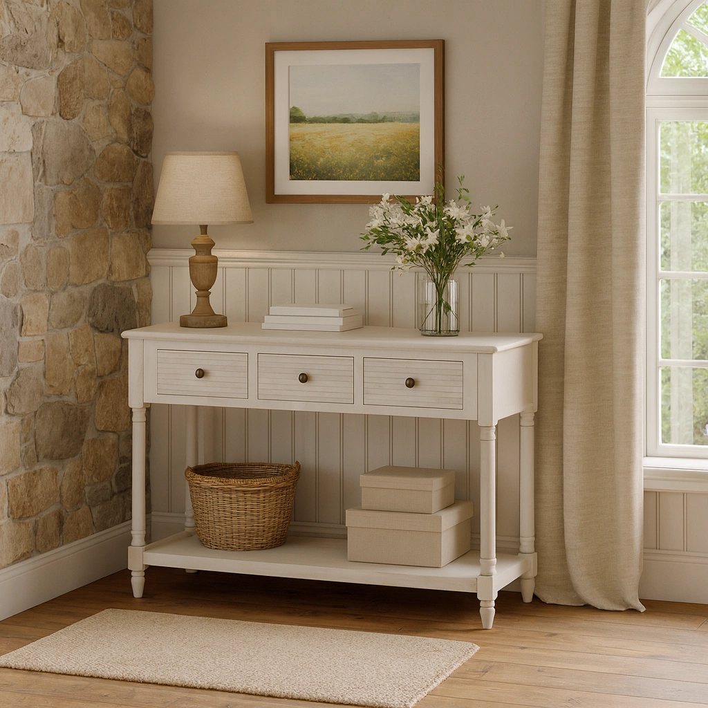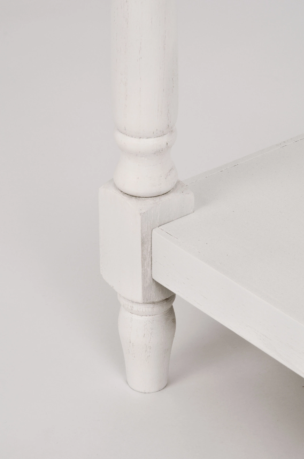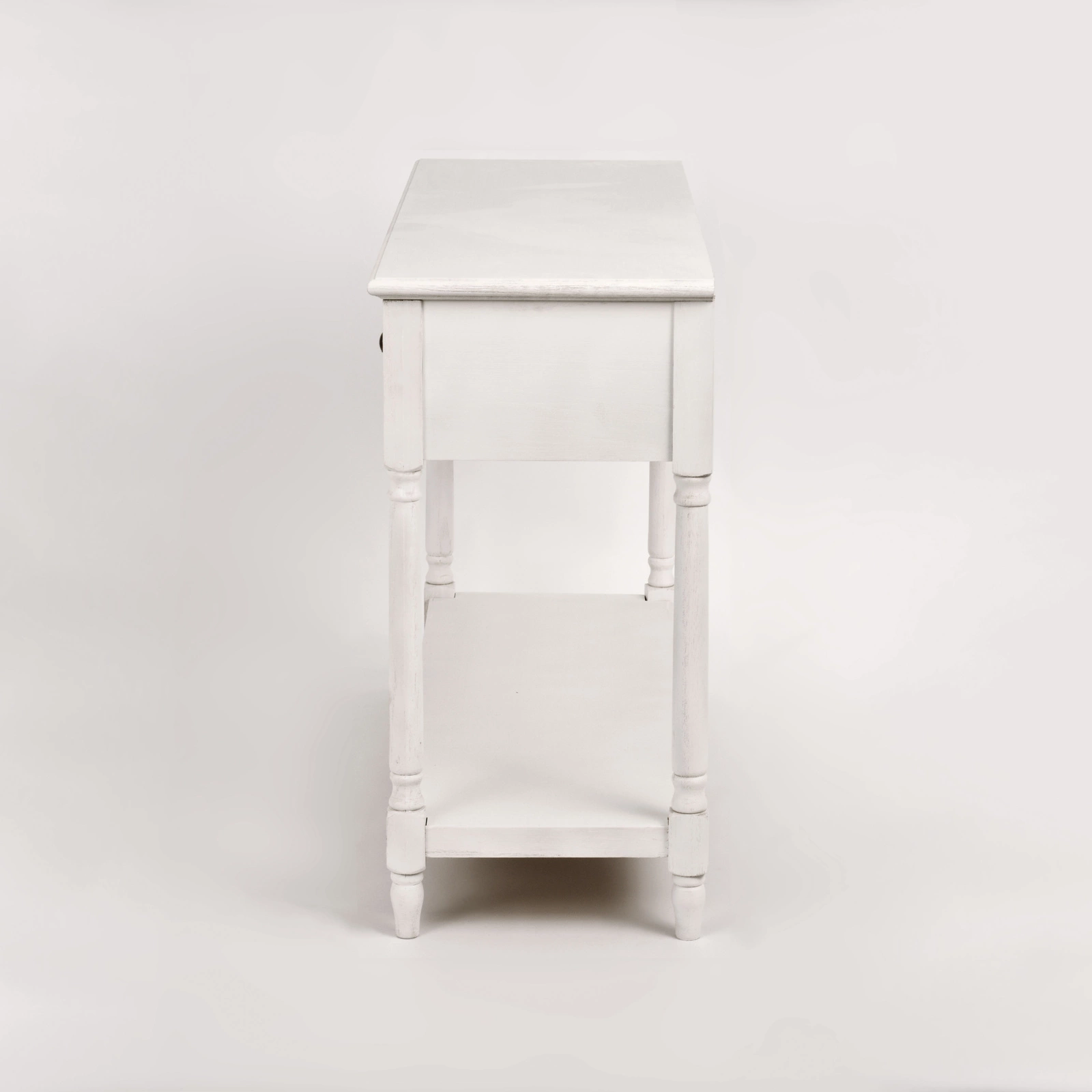 Konsola Livorno została wykonana z połączenia naturalnego drewna paulowni oraz MDF, co gwarantuje trwałość i solidność konstrukcji. Jej powierzchnia pokryta jest białym wykończeniem z efektownymi przetarciami w stylu shabby chic, co nadaje meblowi rustykalnego uroku i podkreśla widoczną strukturę drewna. Metalowe uchwyty oraz drewniane prowadnice szuflad dopełniają całości, zapewniając jednocześnie wygodę użytkowania i wytrzymałość.