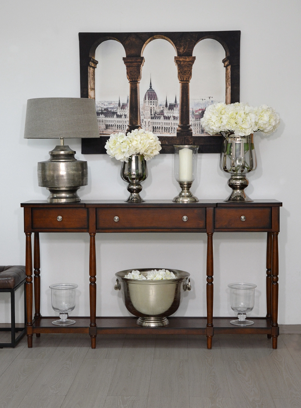 Konsola Avola została zaprojektowana z myślą o praktycznym zastosowaniu w salonie, przedpokoju, jadalni czy pokoju dziennym. Wyposażona jest w 3 pojemne szuflady o różnych wymiarach – szuflada środkowa o wymiarach 64 x 22,5 x 12,5 cm oraz dwie boczne szuflady 33 x 22,5 x 12,5 cm, które pozwalają na wygodne przechowywanie drobiazgów, dokumentów czy akcesoriów codziennego użytku. Dodatkowo konsola posiada solidną półkę, która zwiększa funkcjonalność i przestrzeń do ekspozycji dekoracji lub przechowywania większych przedmiotów.