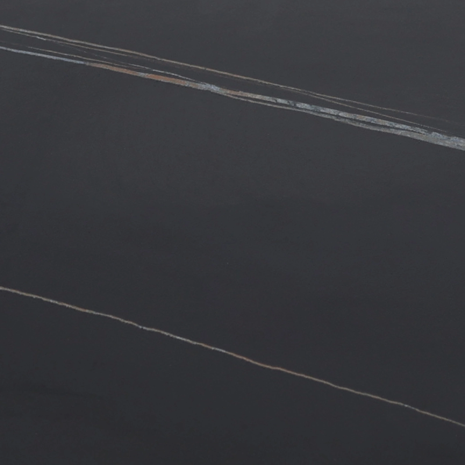 Blat konsoli wyróżnia się subtelną imitacją marmuru w półmacie, która nadaje mu szlachetny charakter i sprawia, że mebel wygląda bardzo luksusowo. Grubość blatu wynosząca 1 cm podkreśla lekkość formy, a jednocześnie zapewnia stabilność. Geometryczna, przestrzenna forma nóg wykonanych ze stali węglowej w kolorze czarnym dodaje konsoli nowoczesnej dynamiki i unikalności. To połączenie materiałów gwarantuje trwałość i odporność na uszkodzenia mechaniczne.