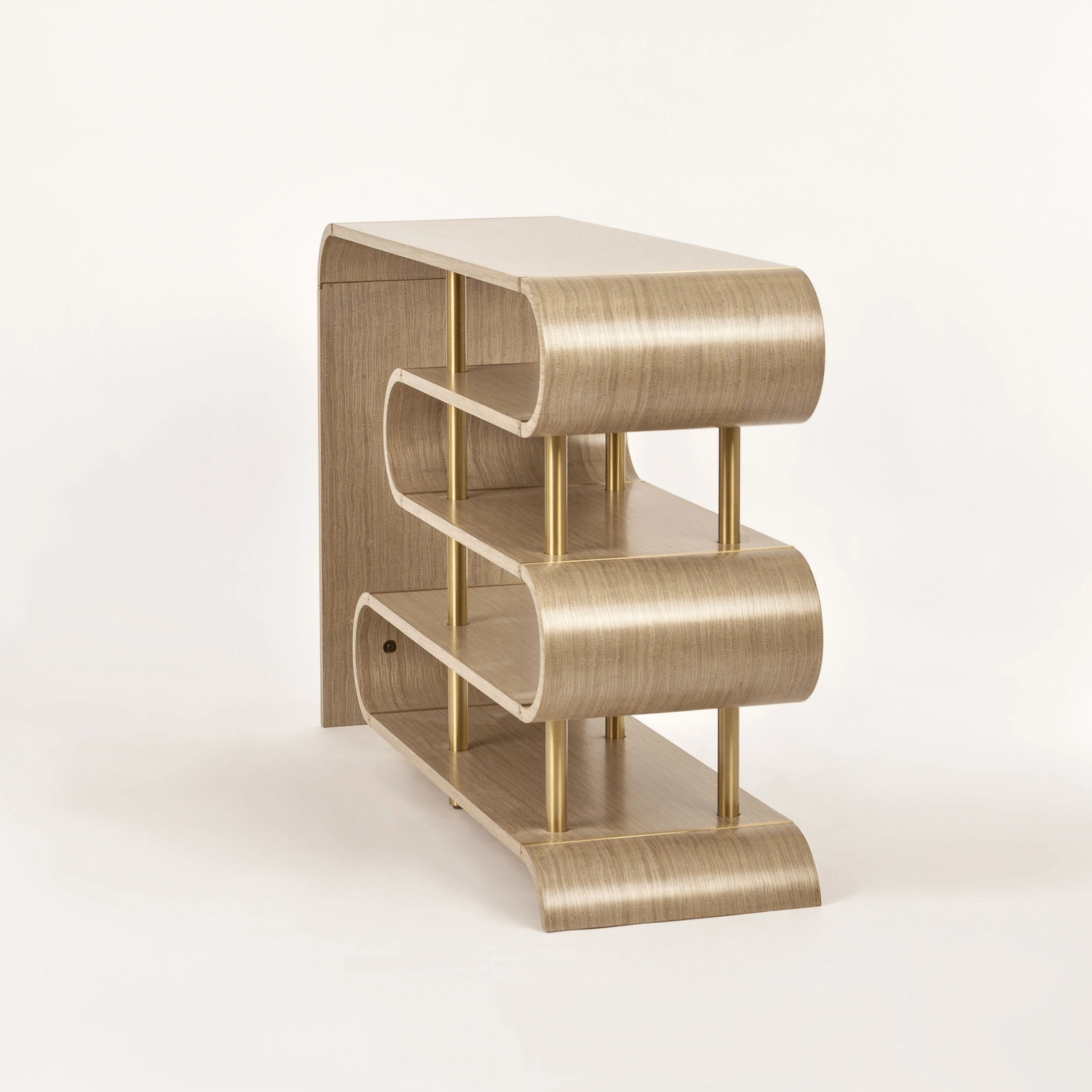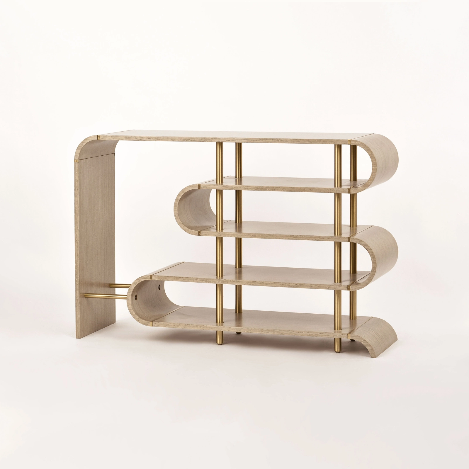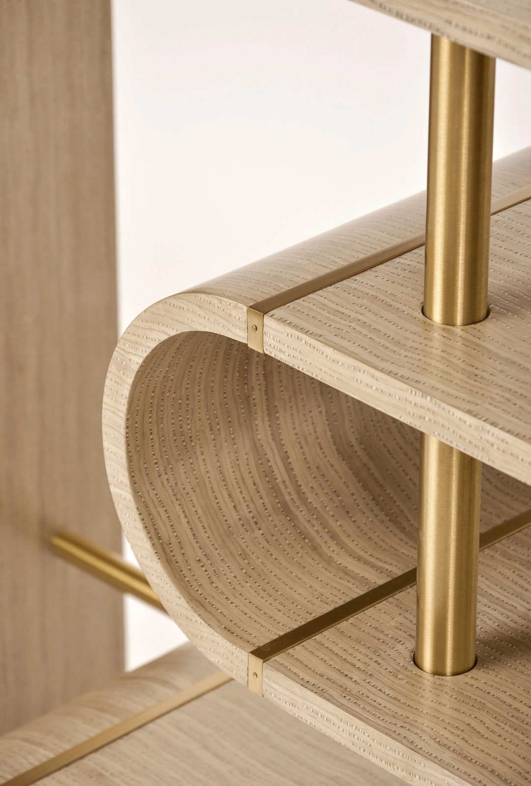 Konsola posiada 4 półki o charakterystycznym sinusoidalnym kształcie, które przyciągają wzrok i nadają meblowi lekkości oraz dynamiki. Połączenie stali nierdzewnej, MDF oraz forniru drewnianego gwarantuje wysoką jakość oraz trwałość na lata. Regulowane ślizgacze u podstawy pozwalają na łatwe dopasowanie stabilności mebla do rodzaju podłoża, chroniąc jednocześnie podłogę przed zarysowaniami.