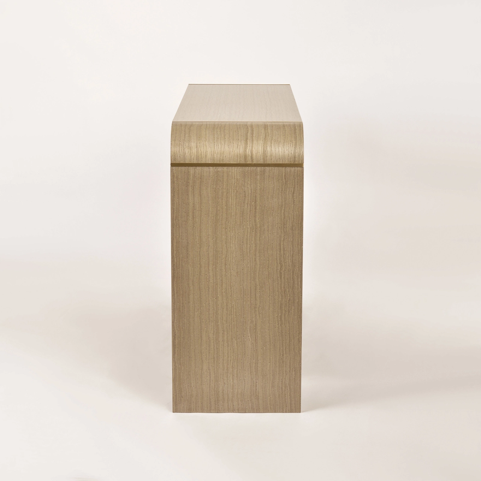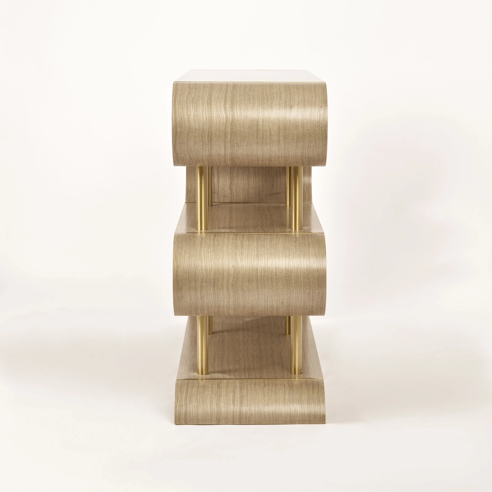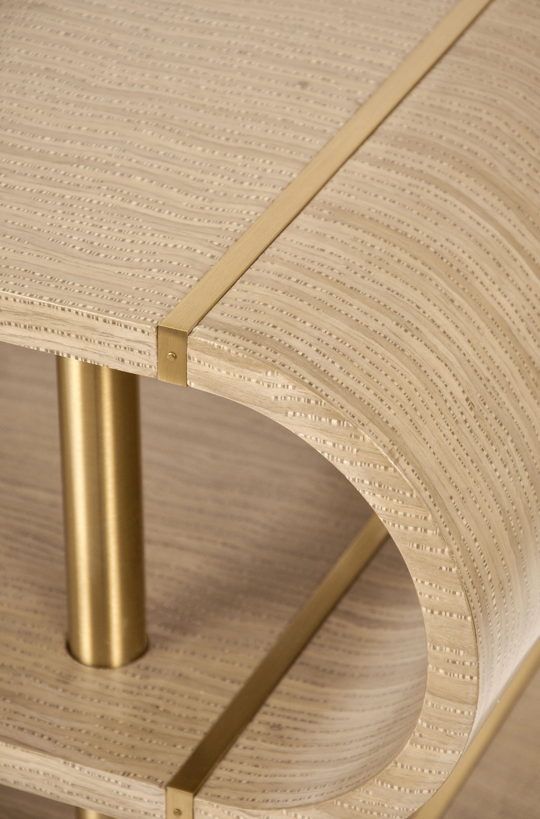 Konsola posiada 4 półki o charakterystycznym sinusoidalnym kształcie, które przyciągają wzrok i nadają meblowi lekkości oraz dynamiki. Połączenie stali nierdzewnej, MDF oraz forniru drewnianego gwarantuje wysoką jakość oraz trwałość na lata. Regulowane ślizgacze u podstawy pozwalają na łatwe dopasowanie stabilności mebla do rodzaju podłoża, chroniąc jednocześnie podłogę przed zarysowaniami.
