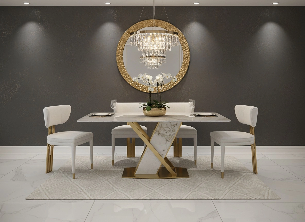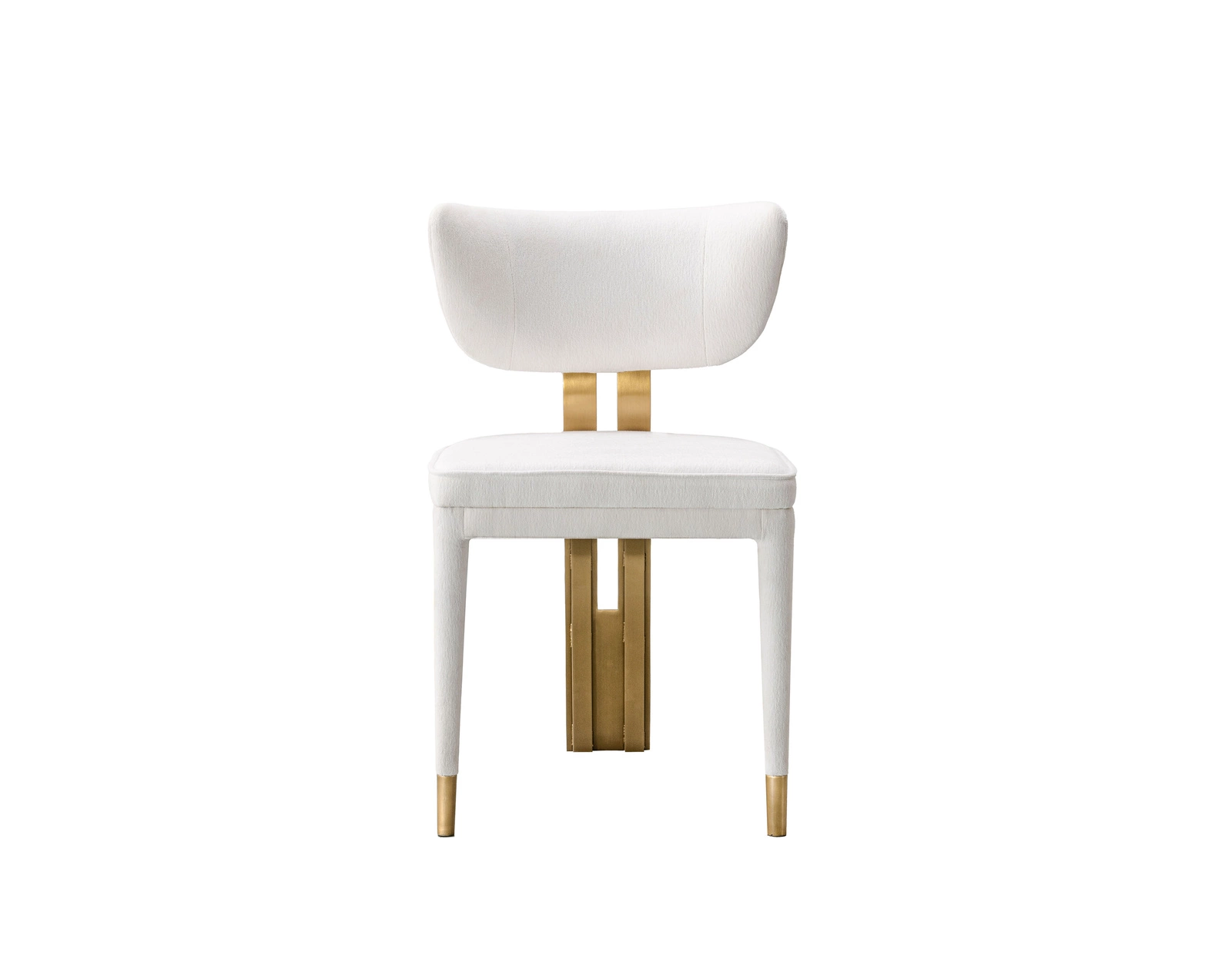 Krzesło zostało wykonane z luksusowej tkaniny szenilowej o szczotkowanej powierzchni, która jest nie tylko przyjemna w dotyku, ale również łatwa w utrzymaniu czystości dzięki kodowi czyszczenia SW (możliwość czyszczenia rozpuszczalnikami i wodą). Tapicerka w białym kolorze wnosi do wnętrza świeżość i uniwersalność. Stabilne nogi wykonane są ze stali nierdzewnej w modnym, złotym kolorze, co podkreśla elegancki charakter krzesła i zapewnia solidność konstrukcji.