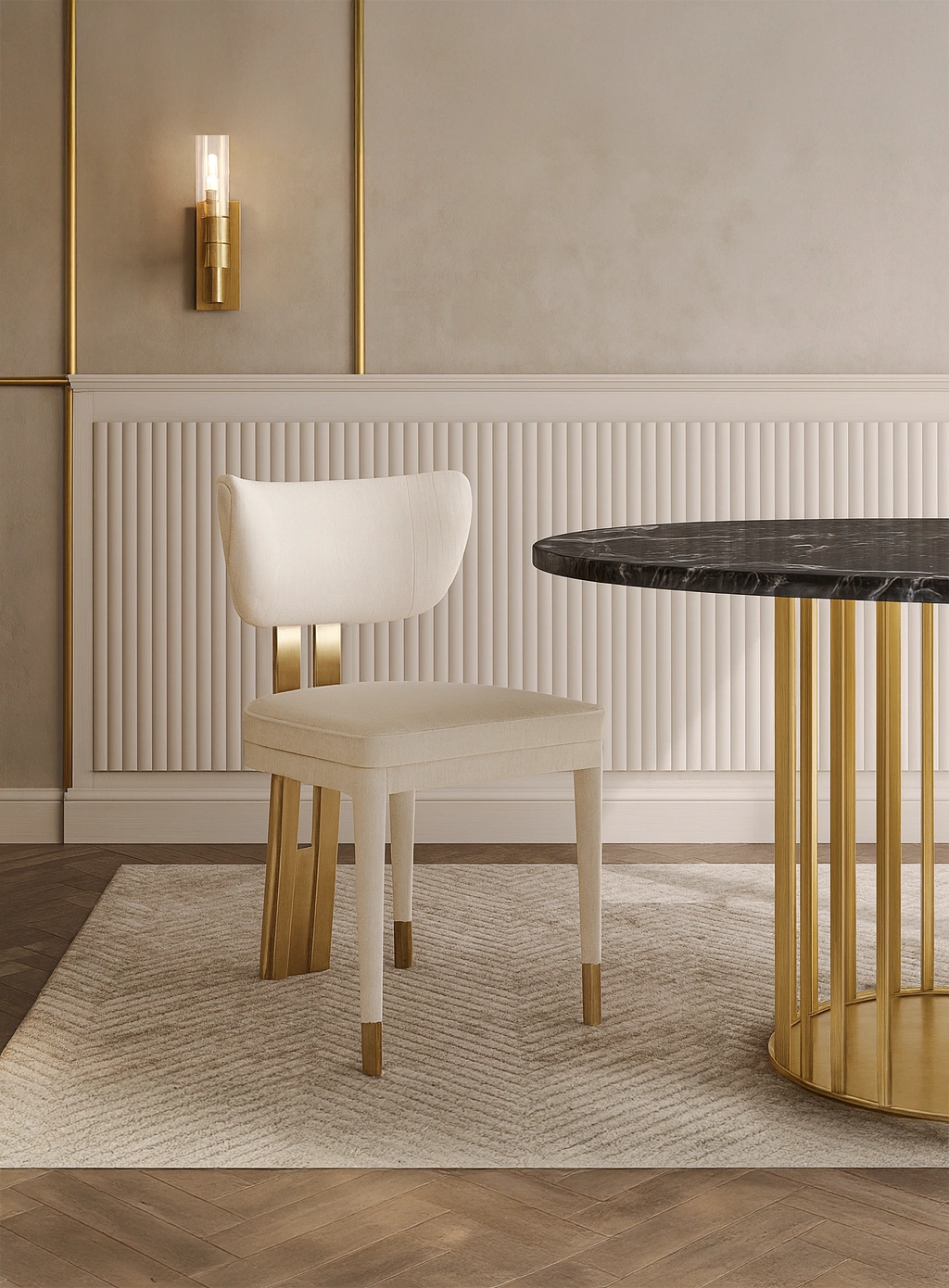 Modig M3-1 to krzesło, które łączy klasyczną elegancję z nowoczesnym wykończeniem. Jasna tapicerka w połączeniu ze złotymi nogami stanowi idealne uzupełnienie wnętrz w stylu skandynawskim, glamour oraz minimalistycznym. Dzięki subtelnym detalom i precyzji wykonania, będzie stanowić mocny akcent dekoracyjny, podnosząc estetykę każdego pomieszczenia.
