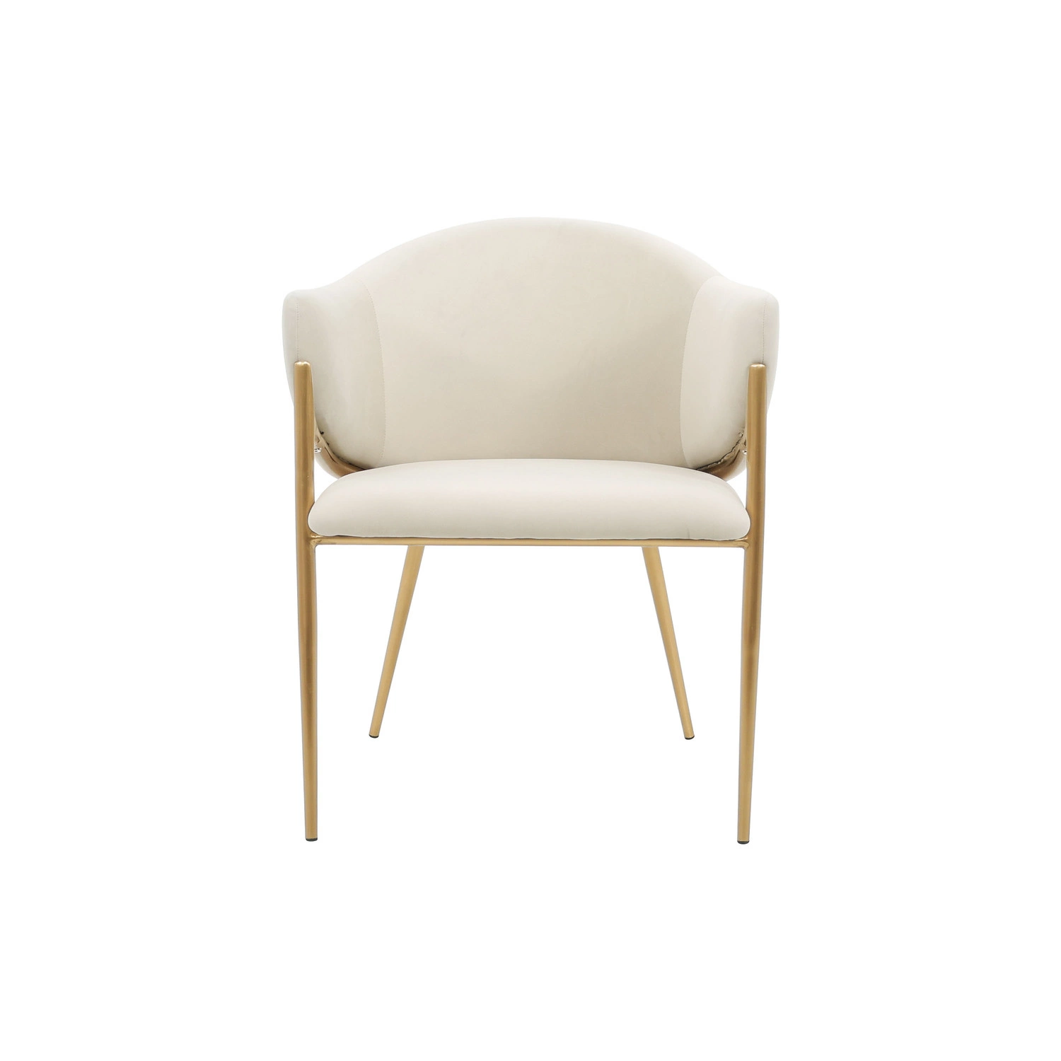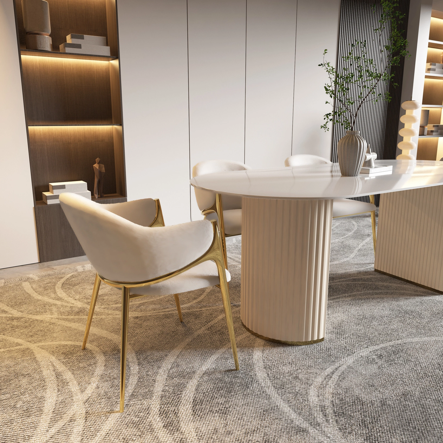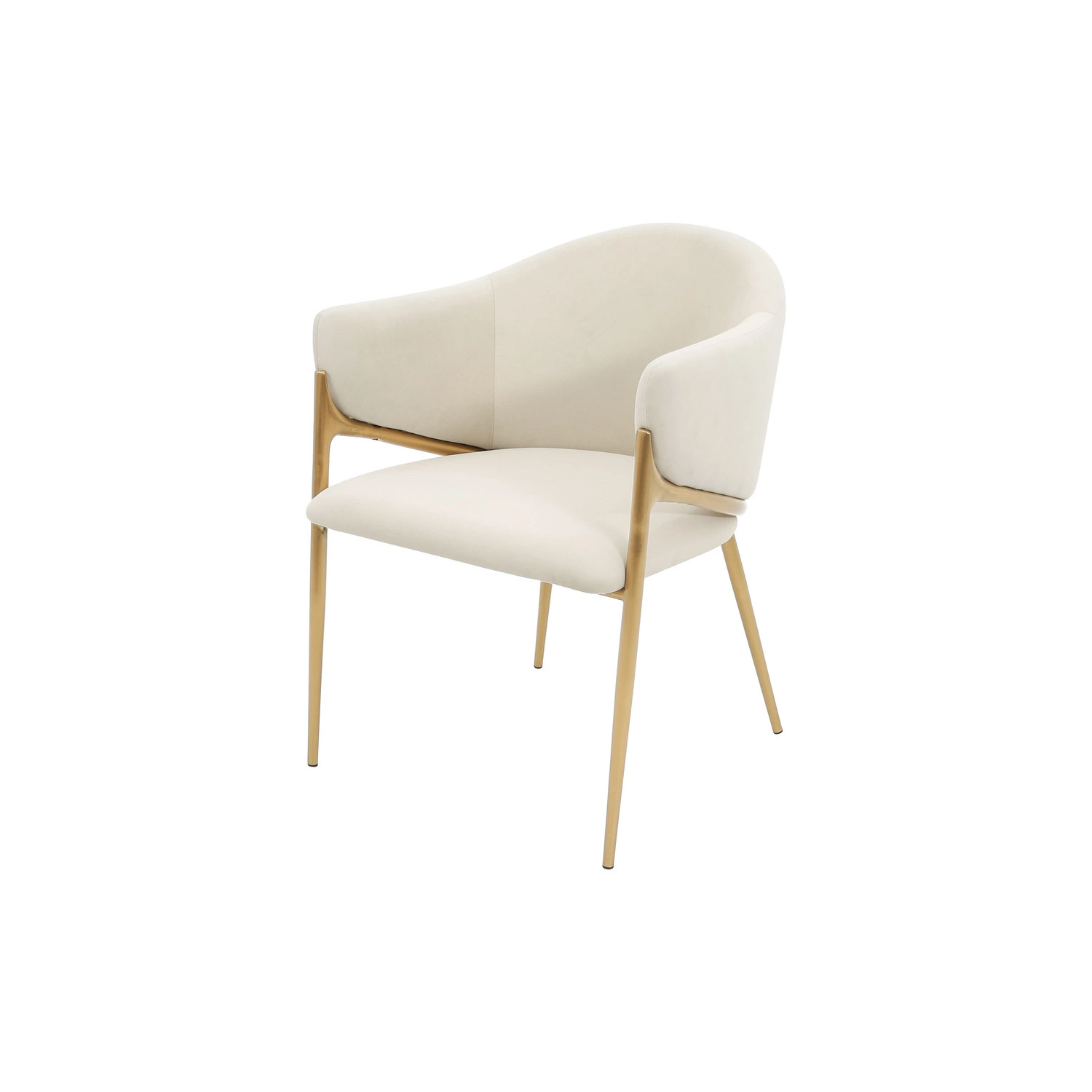 Krzesło tapicerowane Modig M5-10 to doskonałe połączenie nowoczesnego designu i wygody użytkowania. Wykonane z wysokiej jakości tkaniny welurowej w kolorze białego ecru, zachwyca delikatną, gładką fakturą oraz subtelnym połyskiem szczotkowanej powierzchni. Stylowe złote nogi ze stali nierdzewnej dodają meblowi prestiżu i lekkości, czyniąc go idealnym wyborem do każdego eleganckiego wnętrza.