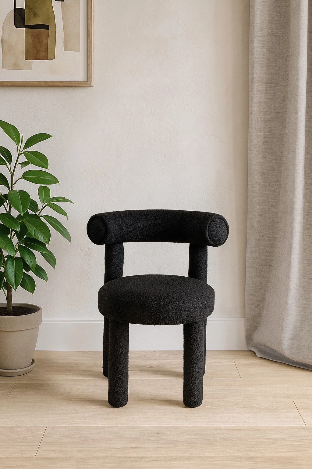 Model LET77BLK wyróżnia się eleganckim, minimalistycznym kształtem oraz starannym wykonaniem. Solidna baza ze sklejki z drewna topoli gwarantuje stabilność i trwałość mebla, a miękka tapicerka z tkaniny boucle zapewnia przyjemne podparcie oraz komfort nawet podczas długiego siedzenia. Oparcie krzesła zostało zaprojektowane tak, by wspierać plecy w odpowiedniej pozycji, co korzystnie wpływa na postawę ciała.