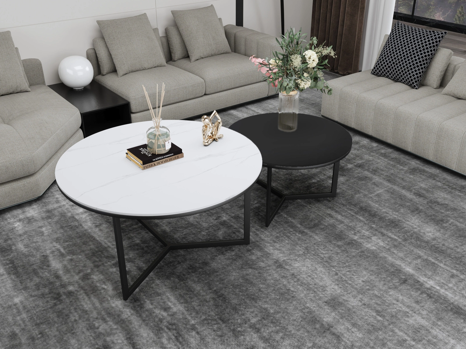 Blaty stolików zostały wykonane ze spiekanego kamienia o grubości 1 cm, co gwarantuje odporność na zarysowania, wysoką temperaturę oraz łatwość w utrzymaniu czystości. Dzięki zastosowaniu półmatowego wykończenia blatu, stoliki prezentują się niezwykle elegancko, jednocześnie unikając niechcianych odblasków. Stabilna podstawa ze stali węglowej w kolorze czarnym zapewnia nie tylko trwałość, lecz także nadaje całości nowoczesny, minimalistyczny charakter.