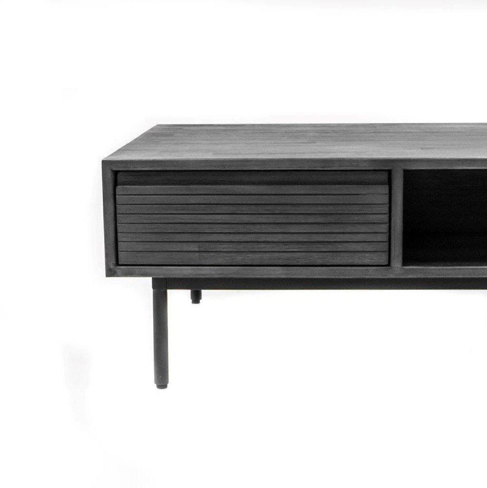 Stolik o wymiarach 120 cm szerokości, 70 cm głębokości oraz 40 cm wysokości został zaprojektowany tak, aby zmieścić najpotrzebniejsze przedmioty codziennego użytku. Dwie pojemne szuflady z frezowanymi uchwytami umożliwiają dyskretne przechowywanie pilotów, czasopism czy drobnych akcesoriów. Dodatkowo dwie półki ułatwiają ekspozycję dekoracji, książek lub podstawowych rzeczy, które warto mieć zawsze pod ręką.