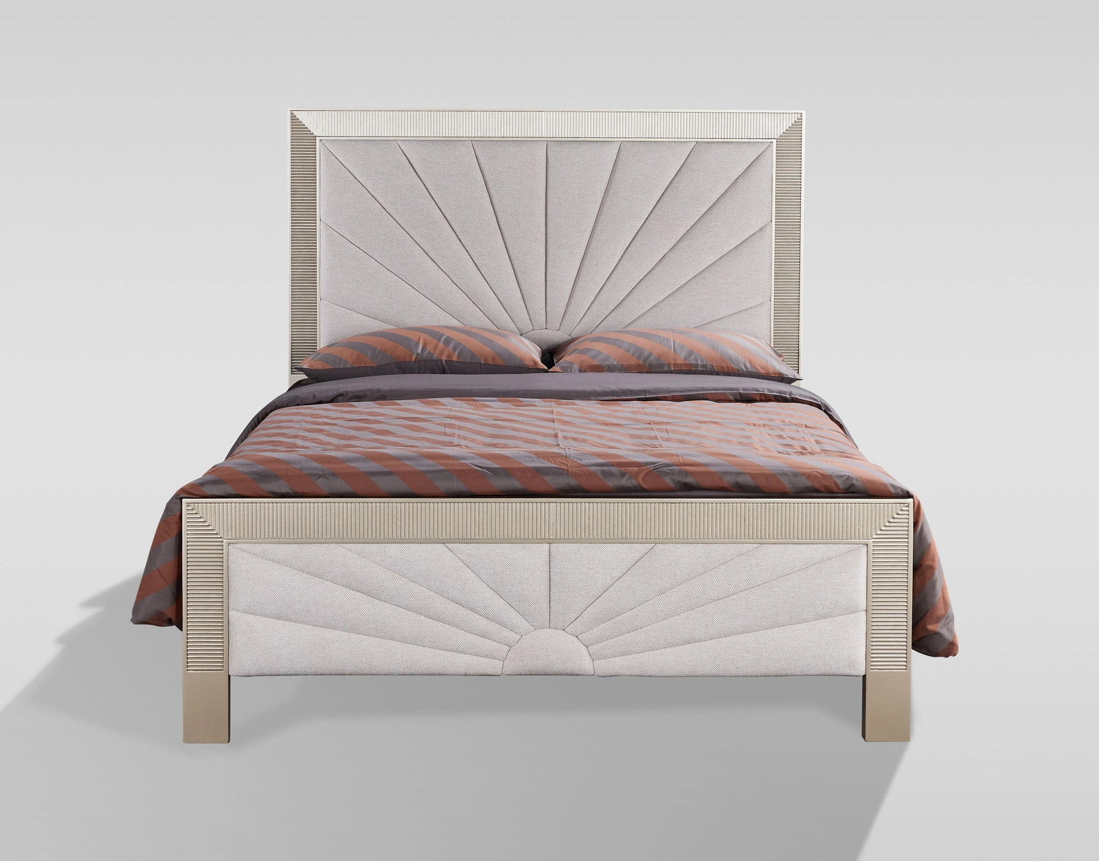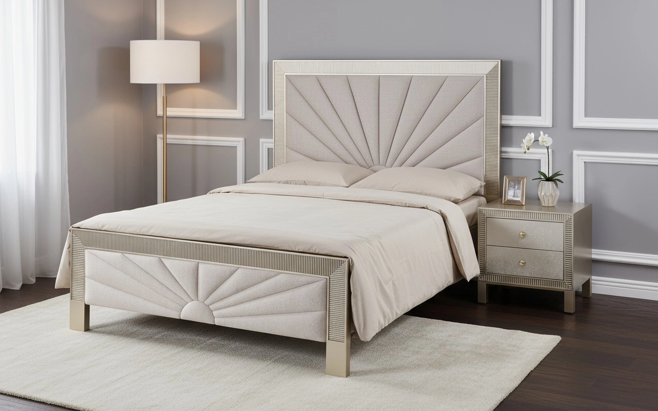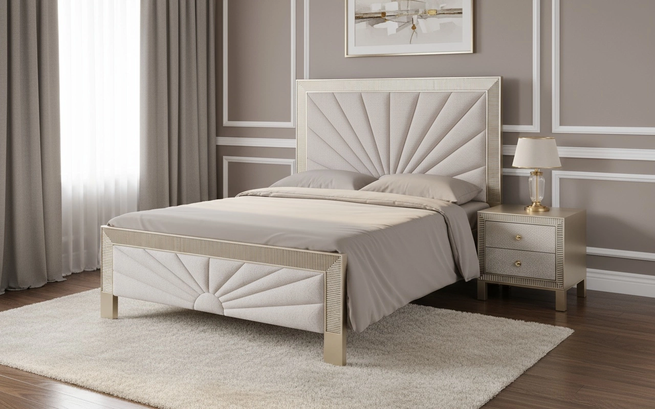 Łóżko tapicerowane Stilig Bedroom ST900Q zostało wykonane z solidnej płyty MDF, która gwarantuje stabilność i trwałość konstrukcji. Użyta tkanina aksamitna o strukturze splotu w kolorze beżowym w połączeniu z elementami w odcieniu szampańskiego złota (kod koloru RAL1035) tworzy elegancką i ponadczasową całość, która będzie harmonijnym uzupełnieniem wielu stylów wnętrz. Ryflowane drewno dodaje meblowi wyjątkowego charakteru i podkreśla jego ekskluzywny wygląd.