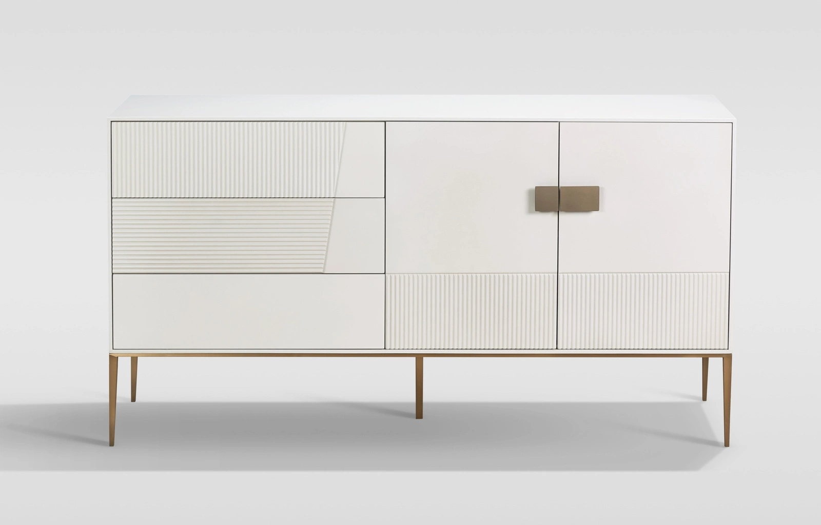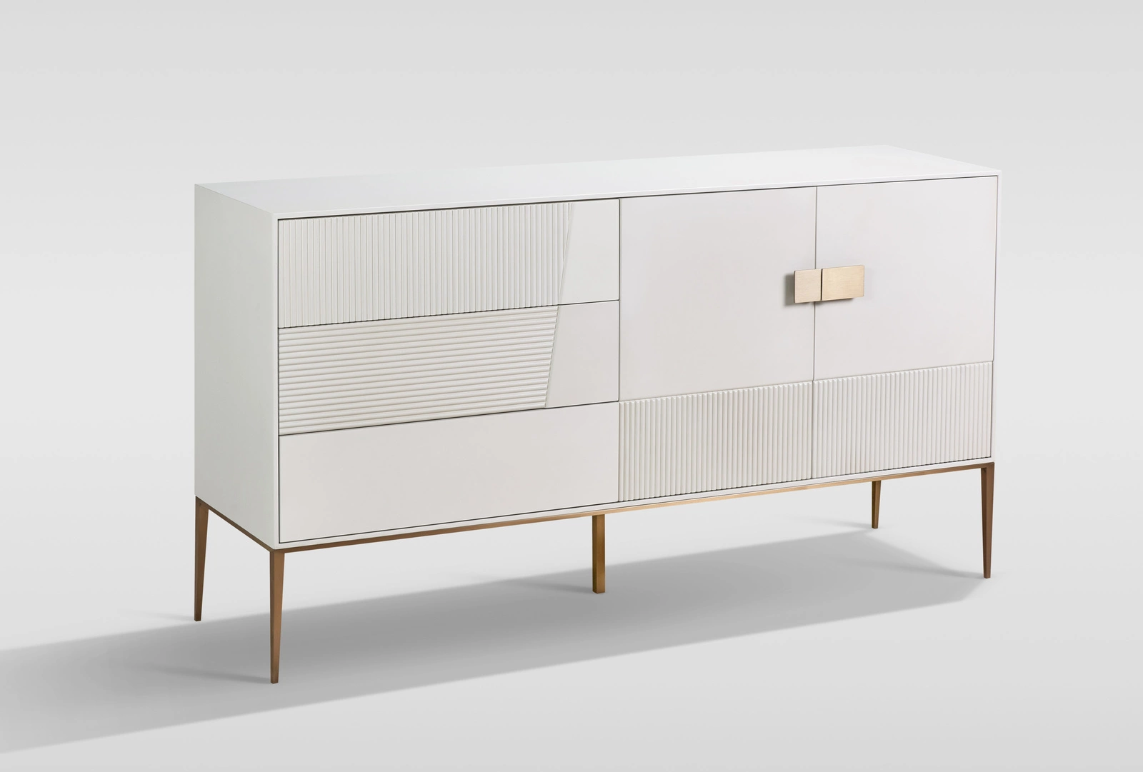 Mebel wykonano z trwałej płyty MDF oraz stali nierdzewnej, co gwarantuje stabilność i wieloletnią wytrzymałość. Złote, metalowe nogi nadają lekkości konstrukcji, a ryflowane drewno stanowi ciekawy detal dekoracyjny, który podkreśla unikalny charakter komody. Dla większej ochrony podłogi zastosowano regulację wysokości ślizgaczy meblowych, co umożliwia dopasowanie mebla do różnych typów powierzchni.