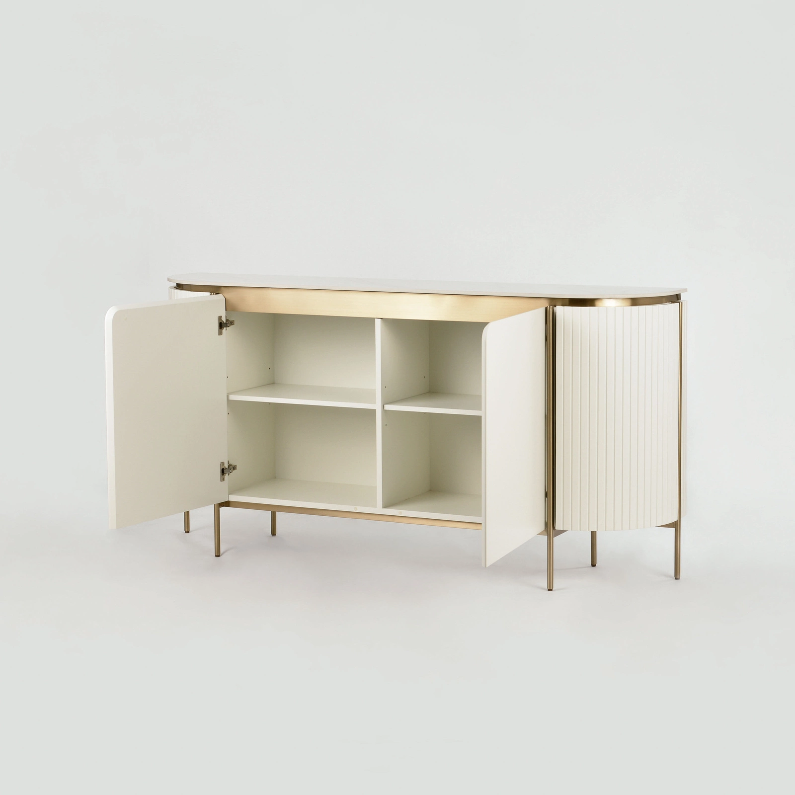 Model Stilig ST121 wyróżnia się eleganckim, minimalistycznym wzornictwem z subtelnymi zdobieniami, takimi jak ryflowane drewno oraz frezowane uchwyty. Złote nogi i akcenty nadają meblowi wyjątkowego charakteru, podkreślając prestiż i indywidualny styl. Blat wykonany z syntetycznego marmuru w połysku jest zarówno estetyczny, jak i odporny na uszkodzenia, dzięki czemu komoda zachowa swój piękny wygląd przez długie lata.