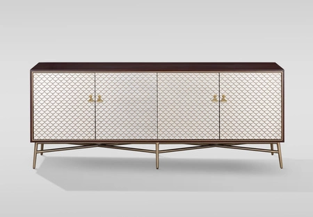 Wykonana z naturalnej okleiny orzecha włoskiego oraz MDF, komoda Stilig ST198 zachwyca trwałością i eleganckim wyglądem. Fronty w kolorze szampańskiego złota z subtelnymi, wytłaczanymi łukami dodają meblowi niepowtarzalnego charakteru i szlachetności. Nogi z wysokogatunkowej stali nierdzewnej oraz metalowe, ozdobne uchwyty w złotym kolorze podkreślają ekskluzywny styl i dbają o trwałość produktu przez lata użytkowania.