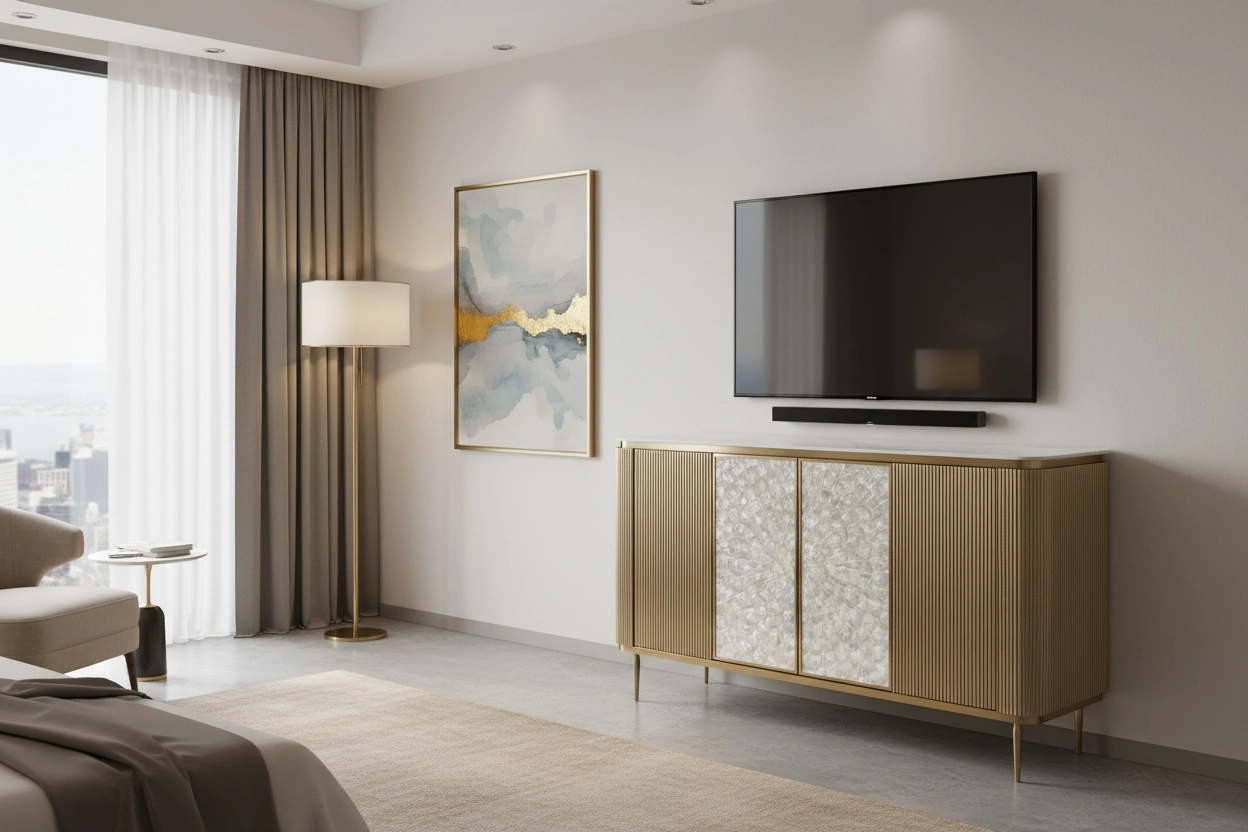 MDF, naturalna muszla morska, stal nierdzewna, blat: marmur syntetyczny