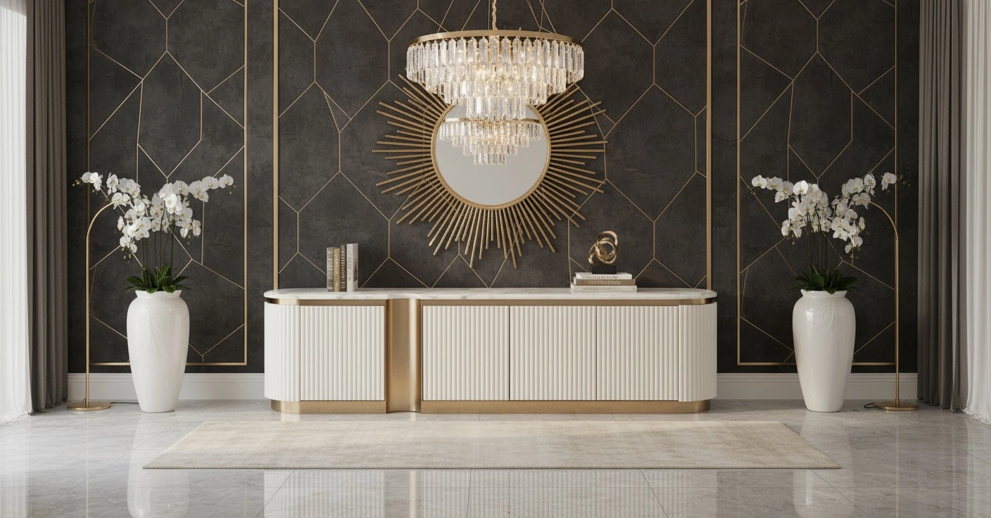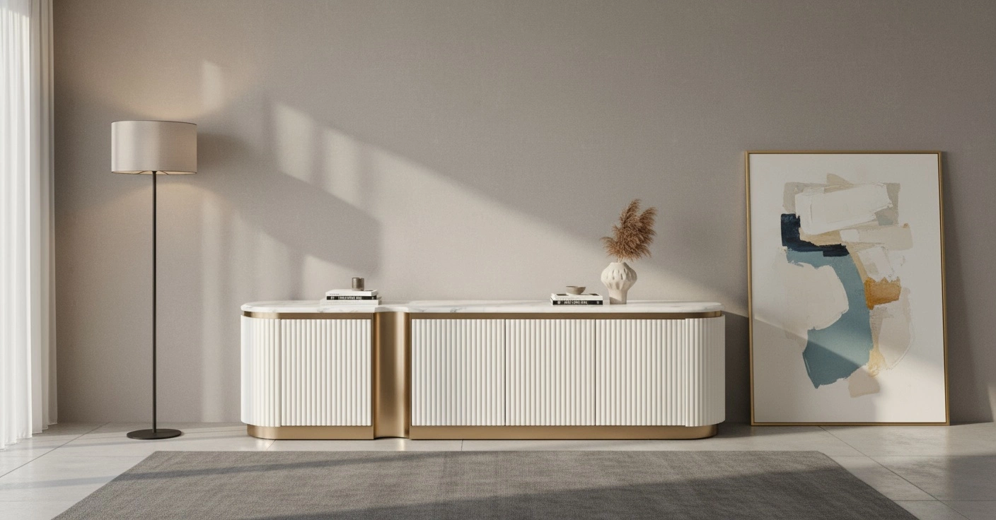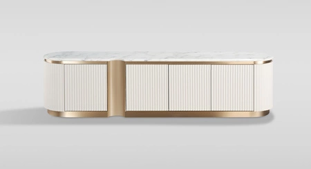 Ryflowane drewno;marmur syntetyczny;system push to open;regulowana wysokość półek;system soft close;regulacja wysokości ślizgaczy meblowych podłogowych;blat w połysku