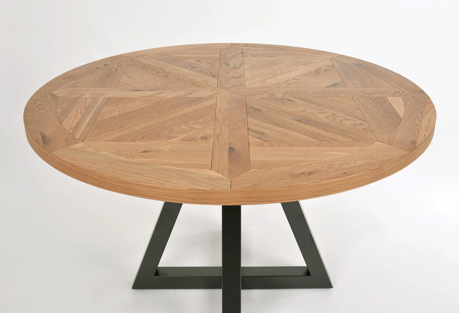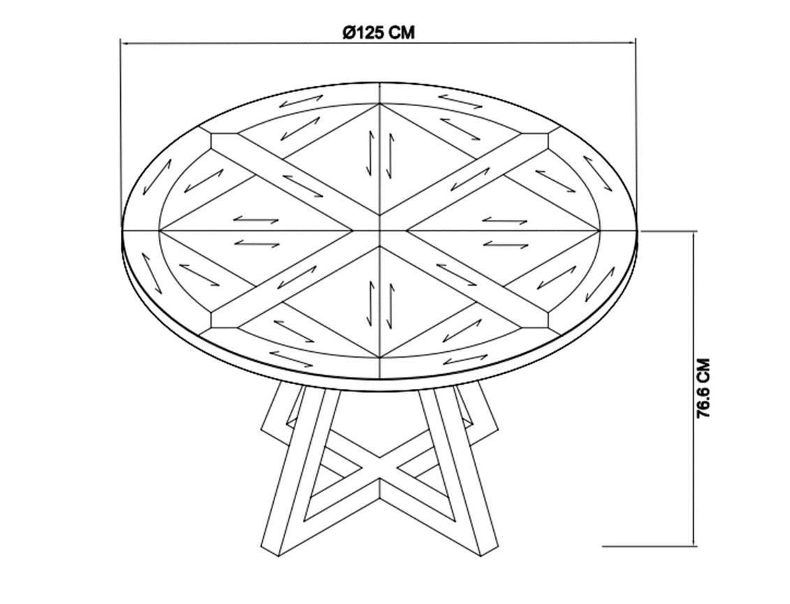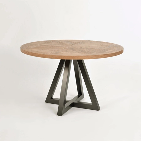Blat stołu wykonano z odpornego na uszkodzenia i zarysowania drewna dębowego, zachowanego w naturalnym, ciepłym odcieniu. Sercem tego modelu jest piękna intarsja, która nadaje powierzchni unikalnego charakteru oraz podkreśla ręczne wykonanie detali. Solidne, metalowe nogi w kolorze ciemnego grafitu zapewniają stabilność i nadają całości surowego, industrialnego stylu. Wysokość 76,5 cm oraz średnica blatu 125 cm sprawiają, że stół jest wygodny do codziennego użytku, zarówno w przestrzeni jadalnianej, jak i w biurze czy kawiarni.