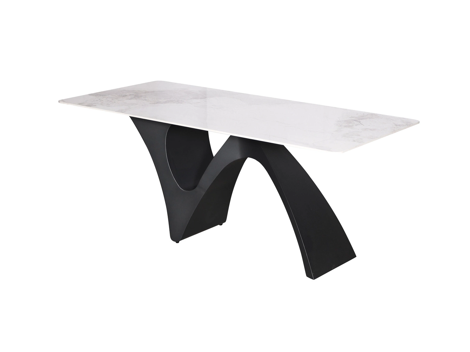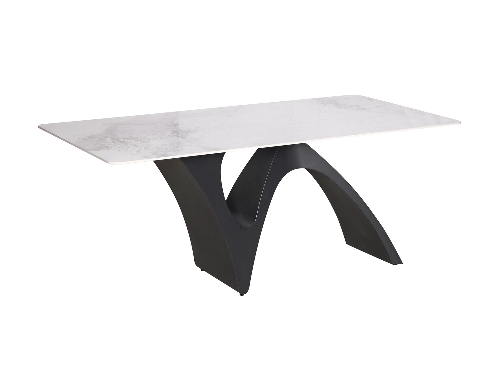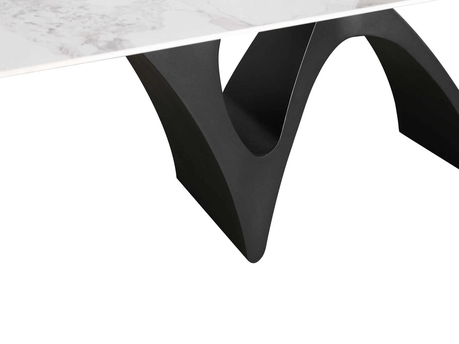 Blat stołu wykonany jest z spiekanego kamienia z eleganckim wykończeniem w połysku, imitującym biały marmur. Ta powierzchnia nie tylko prezentuje się niezwykle efektownie, ale także jest odporna na zarysowania, wysoką temperaturę i wilgoć, dzięki czemu stół zachowa swój doskonały wygląd przez wiele lat użytkowania. Solidne nogi stalowe w kolorze grafitowym gwarantują stabilność i wytrzymałość, jednocześnie dodając meblowi nowoczesnego charakteru dzięki geometrycznemu kształtowi, który pełni funkcję designerskiej bryły przestrzennej.