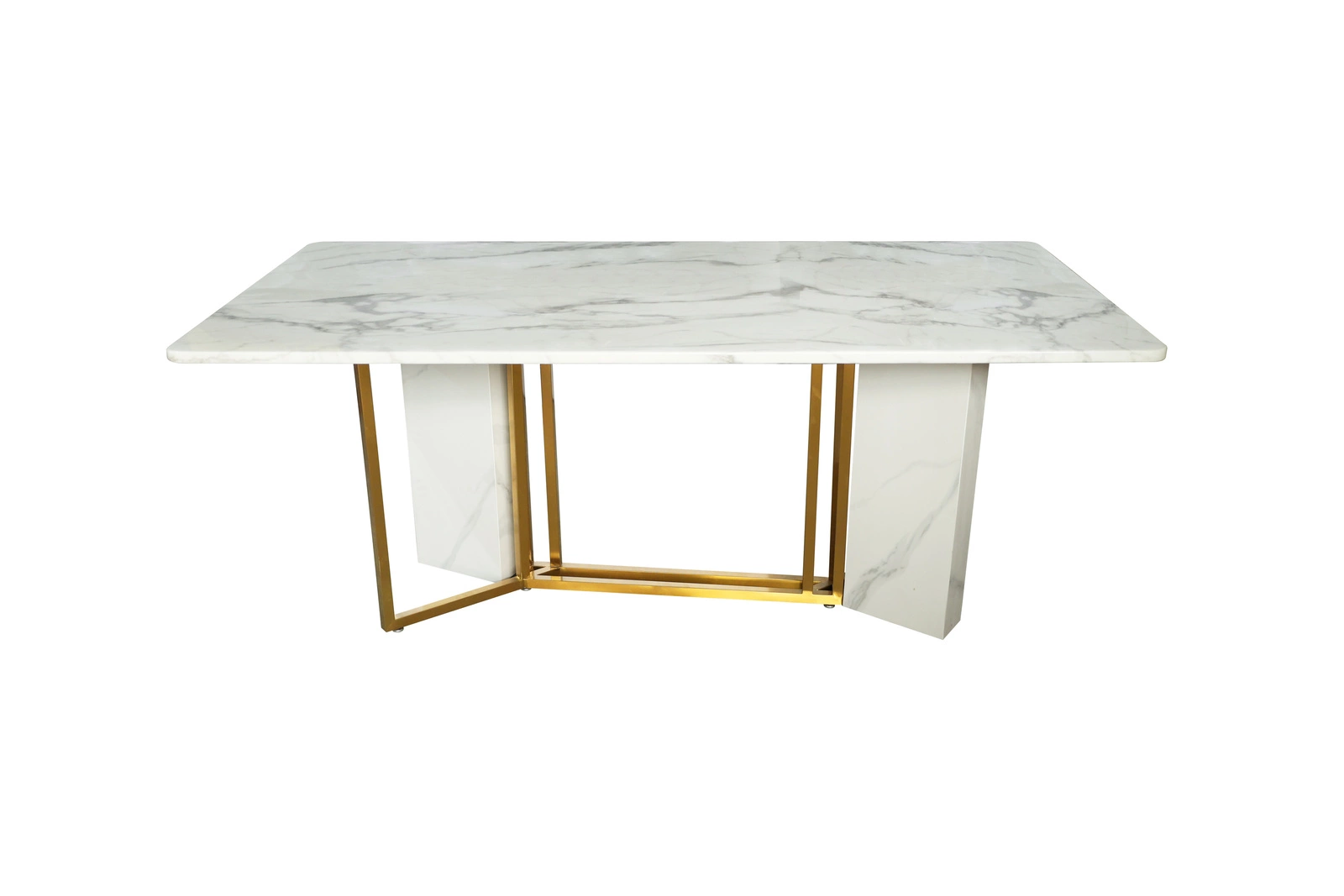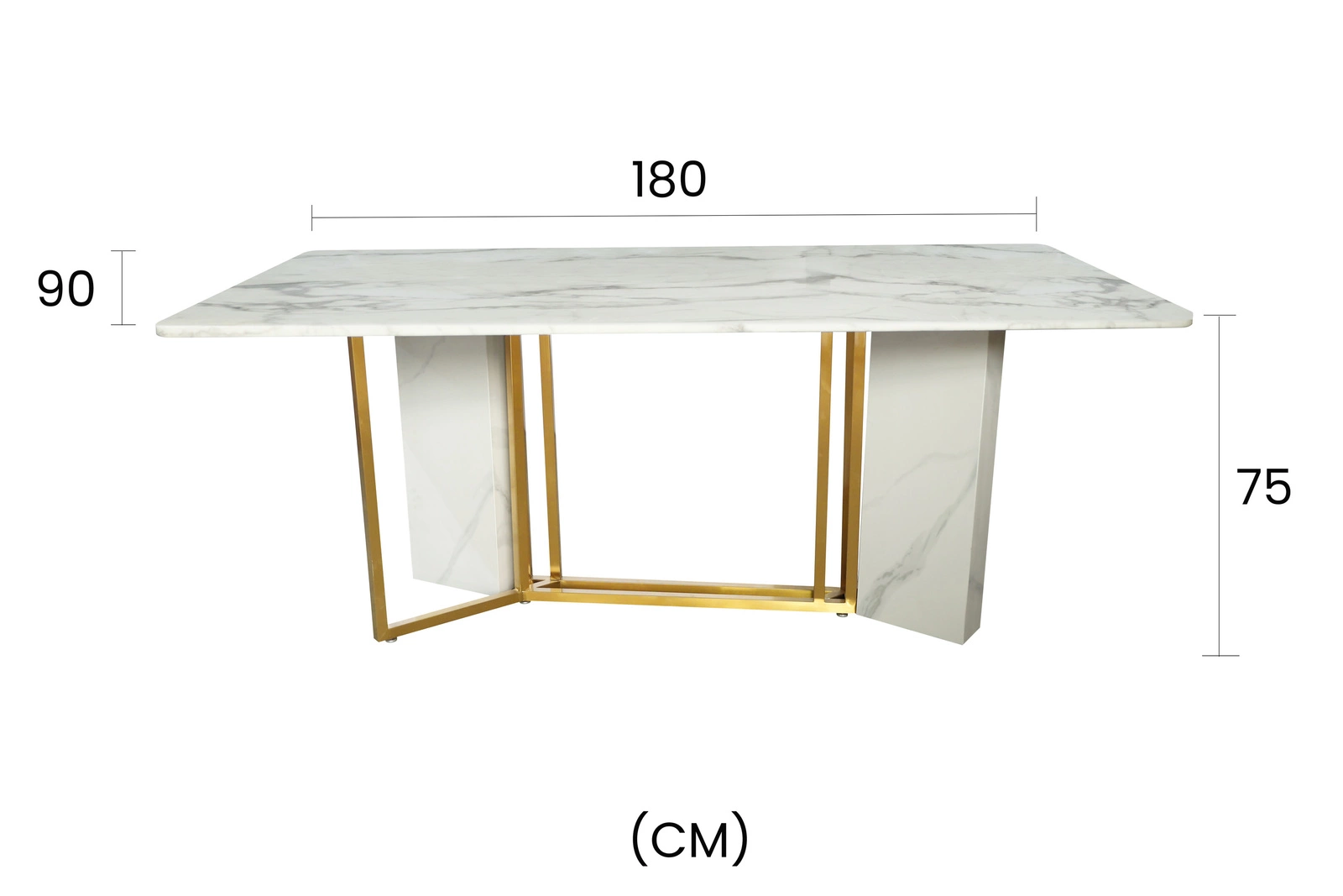 Stół prostokątny złote nogi 180 cm Modig M41 to wyjątkowy mebel, który łączy w sobie nowoczesny design z funkcjonalnością. Dzięki zastosowaniu wysokiej jakości materiałów takich jak stal nierdzewna szczotkowana oraz blat imitujący marmur, stół stanowi doskonały element wystroju wnętrz o różnorodnym charakterze. Złote nogi i akcenty nadają mu luksusowy, a zarazem subtelny charakter, który wzbogaci każde pomieszczenie.