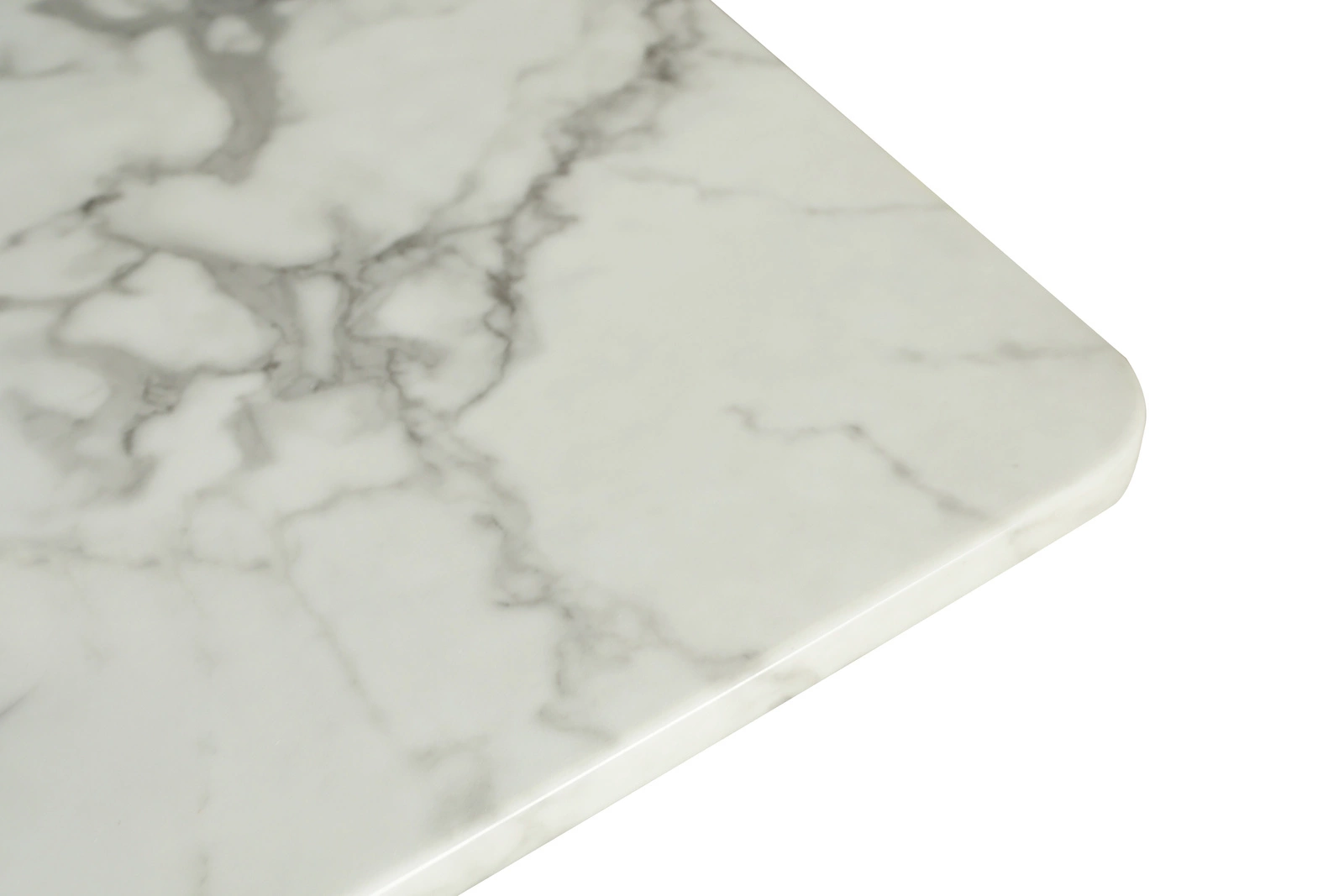 Grafika stołu Modig M41 to połączenie elegancji i trwałości. Blat o wymiarach 180x90 cm wyróżnia się białym kolorem z wykończeniem w połysku, a jego grubość to 1 cm, co zapewnia odpowiednią solidność i estetykę. Nogi wykonane ze stali nierdzewnej w złotym, szczotkowanym wykończeniu nie tylko stabilizują mebel, ale także nadają mu wyjątkowy charakter. Gładka powierzchnia imitująca marmur sprawia, że stół łatwo utrzymać w czystości i zachowa swój atrakcyjny wygląd przez długie lata.