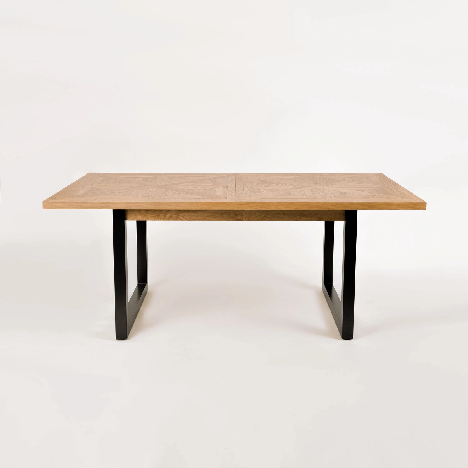 Konstrukcja stołu została oparta na solidnych, metalowych nogach w kolorze ciemnego grafitu, które stabilnie podtrzymują blat wykonany z naturalnego drewna dębowego. Dąb charakteryzuje się trwałością i odpornością na uszkodzenia mechaniczne, dzięki czemu stół utrzymuje swój piękny wygląd przez długie lata użytkowania. Dodatkowym atutem jest finezyjna intarsja na blacie, która nadaje meblowi unikalnego, wyrafinowanego charakteru i wyraźnie wyróżnia go na tle innych produktów dostępnych na rynku.