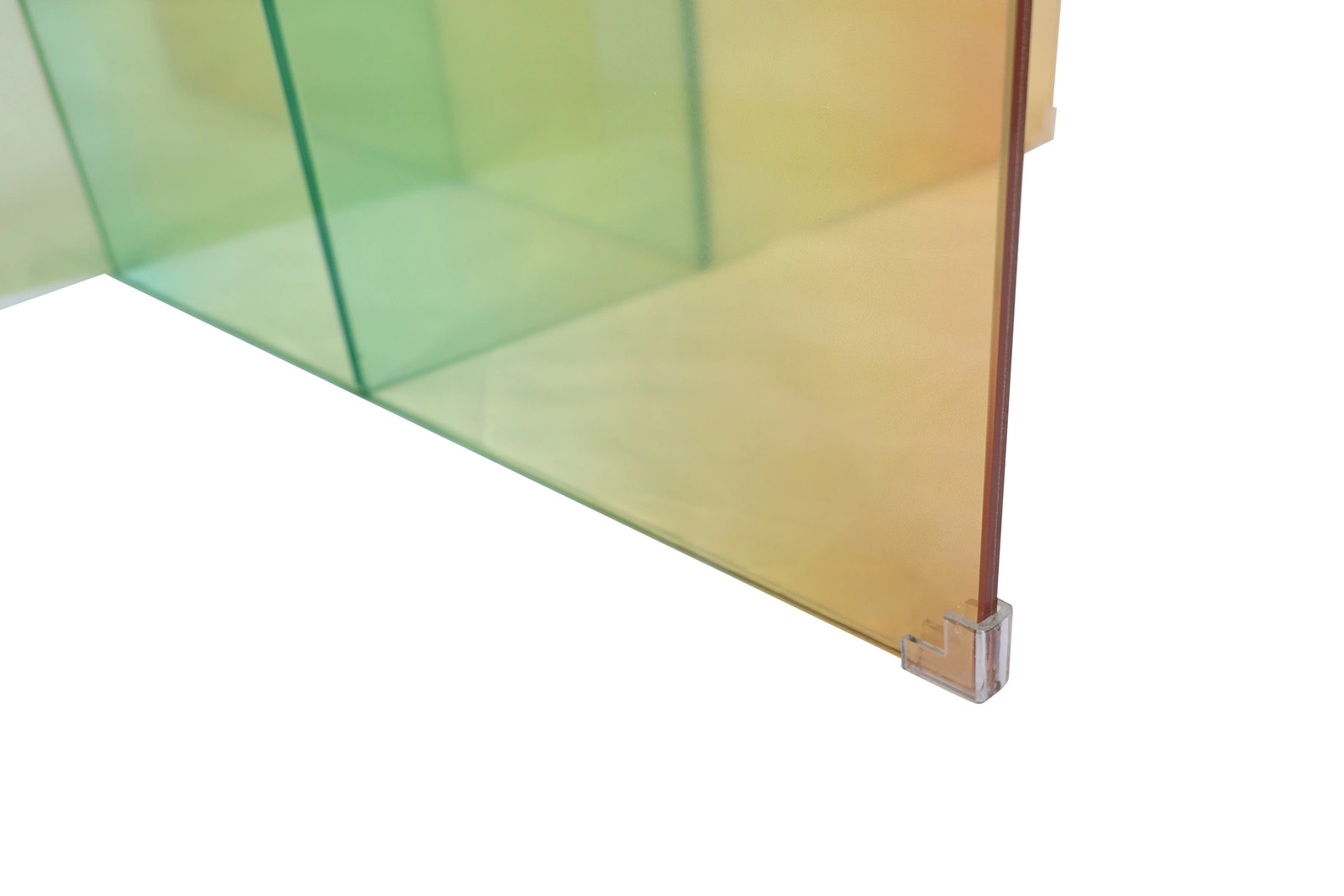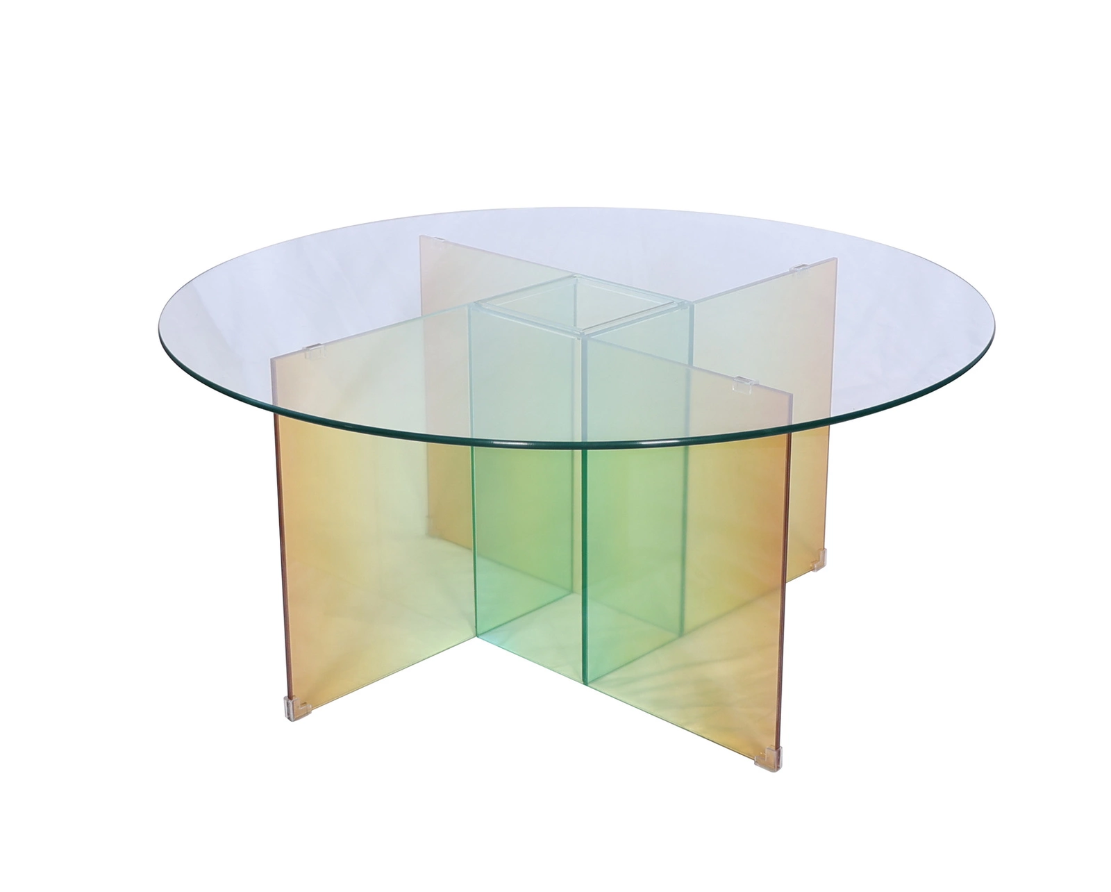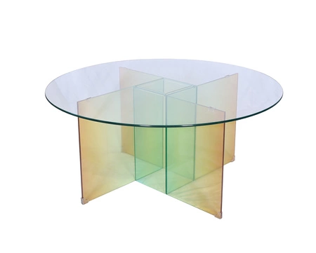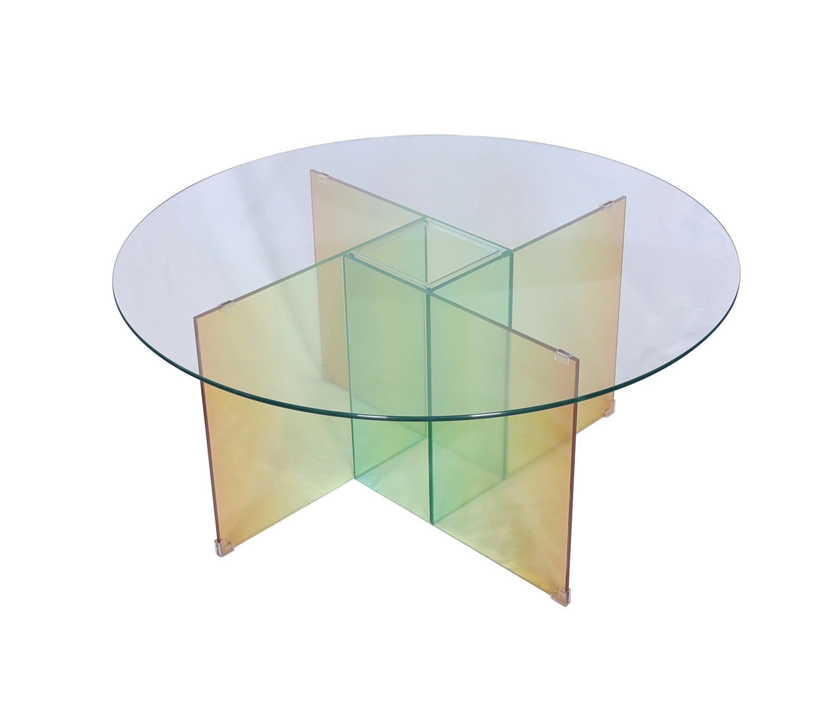 Stolik kawowy został wykonany z najwyższej jakości laminowanego szkła oraz szkła hartowanego, co gwarantuje trwałość i bezpieczeństwo użytkowania. Charakterystyczny dla tego modelu jest blat z opalizującego, przezroczystego szkła, który dzięki specjalnej powłoce zmienia barwy w zależności od kąta padania światła. Efekty kolorystyczne nadają meblowi unikalny, niemal magiczny wygląd, który przyciąga wzrok i podkreśla indywidualny styl wnętrza.