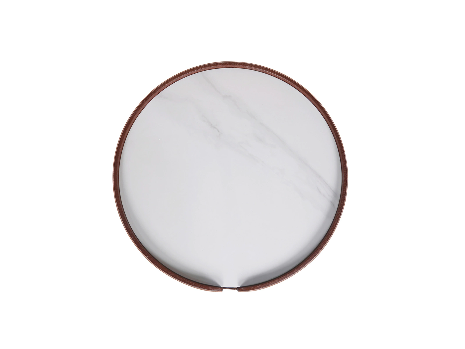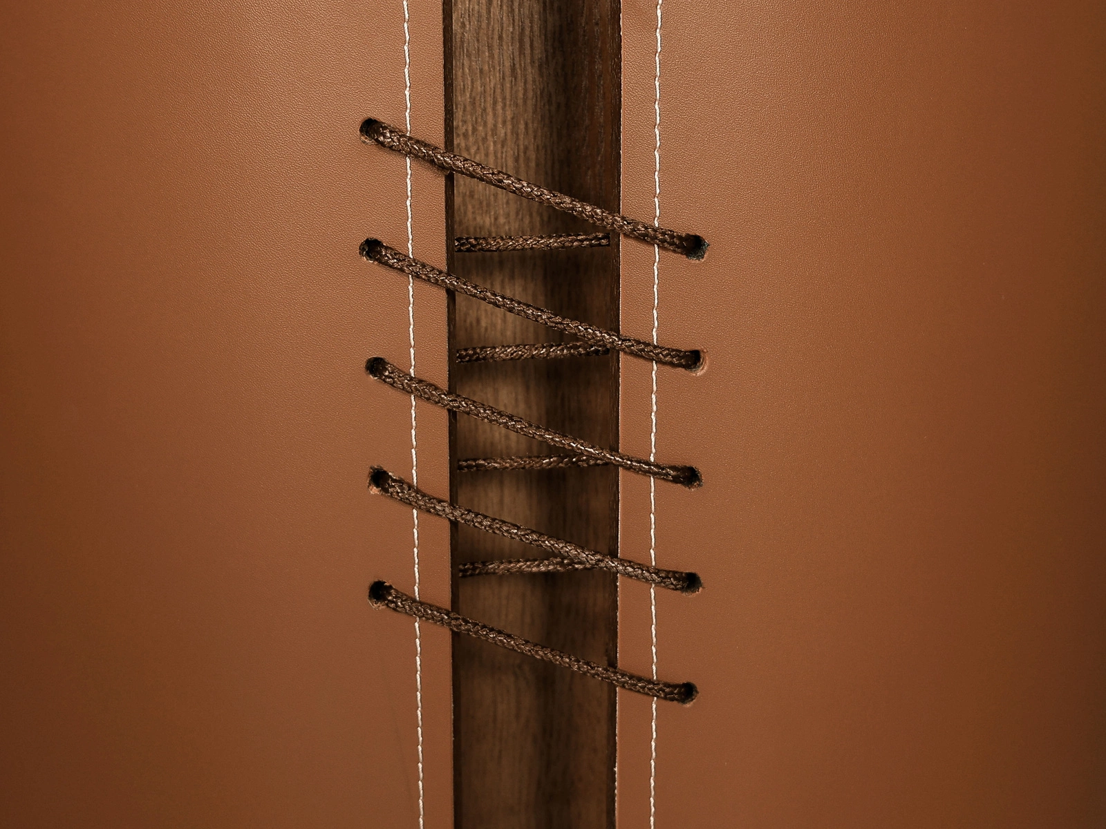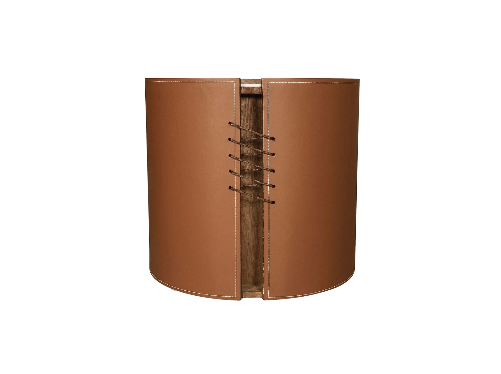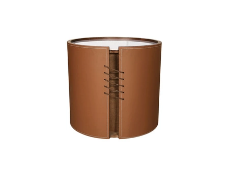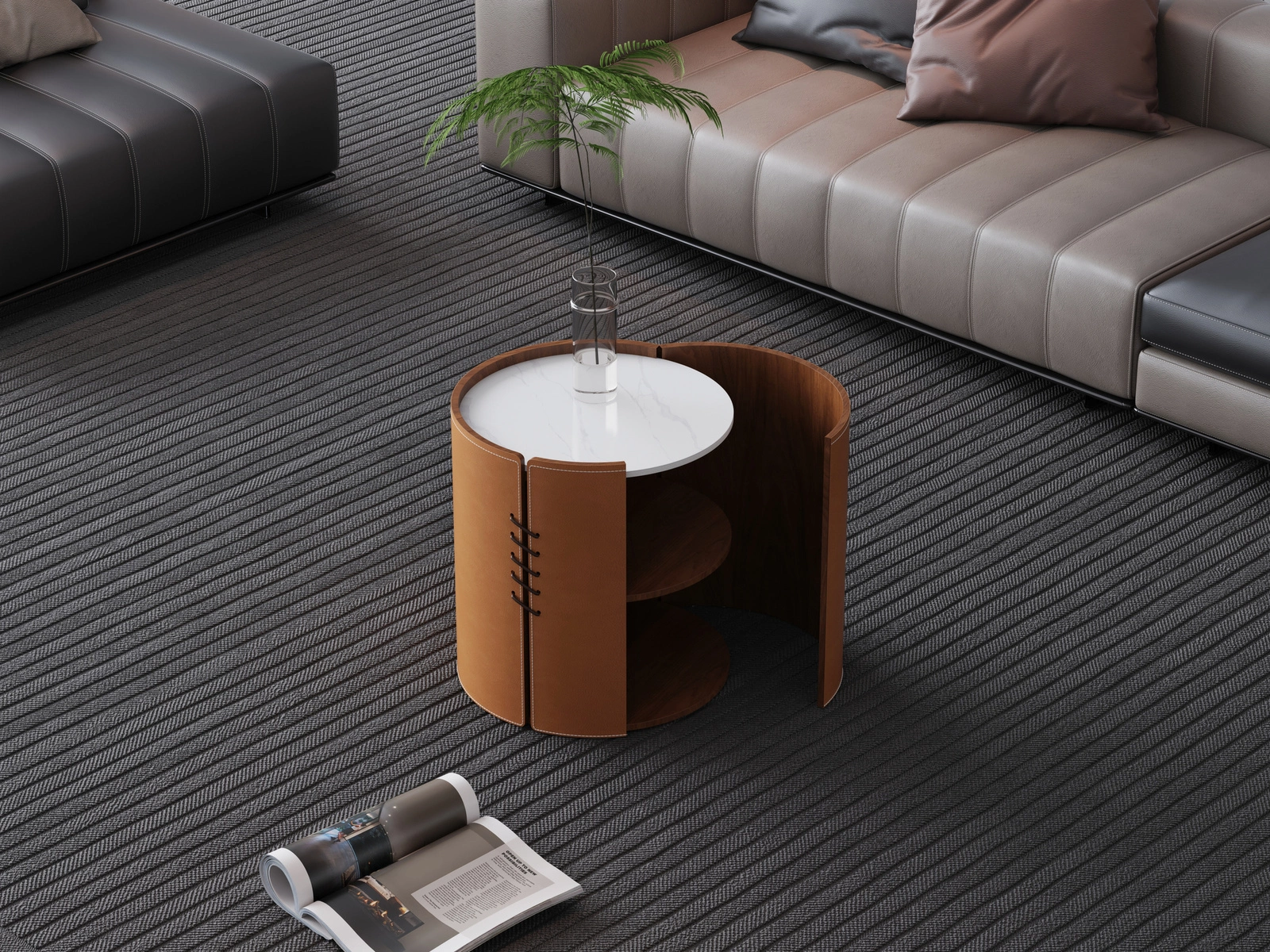 Szafka wykonana jest z trwałej sklejki z drewna topoli, która gwarantuje stabilność i wytrzymałość przez lata użytkowania. Blat z spiekanego kamienia w połysku imitującym marmur nadaje meblowi luksusowy charakter, a zastosowana w szafce ekoskóra w kolorze Siena palona podkreśla nowoczesną stylistykę i zapewnia łatwość utrzymania czystości. Całość utrzymana jest w modnym odcieniu palonej Sieny, który doskonale komponuje się z różnorodnymi aranżacjami wnętrz.