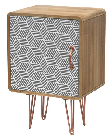 Szafka nocna Portofino F046 to wyjątkowy mebel, który łączy w sobie funkcjonalność oraz niepowtarzalny design. Wykonana z naturalnego drewna jodły, zachwyca swoją trwałością i estetyką. Dzięki starannie dobranym detalom, takim jak metalowe nogi w kolorze miedzianym oraz oryginalny wielokolorowy wzór na froncie, szafka wprowadzi do Twojej sypialni przytulny i stylowy klimat.