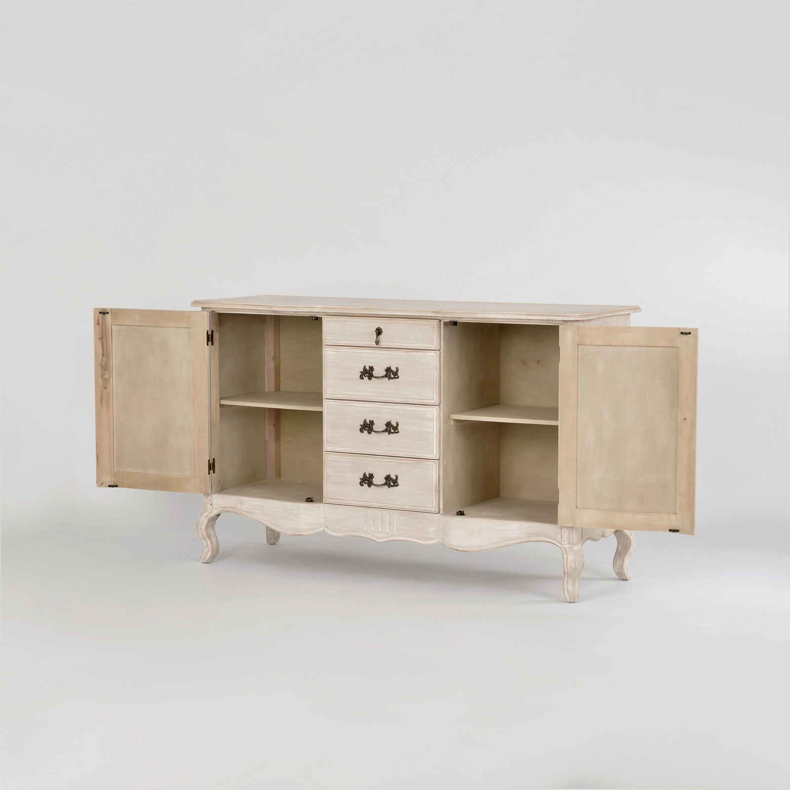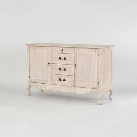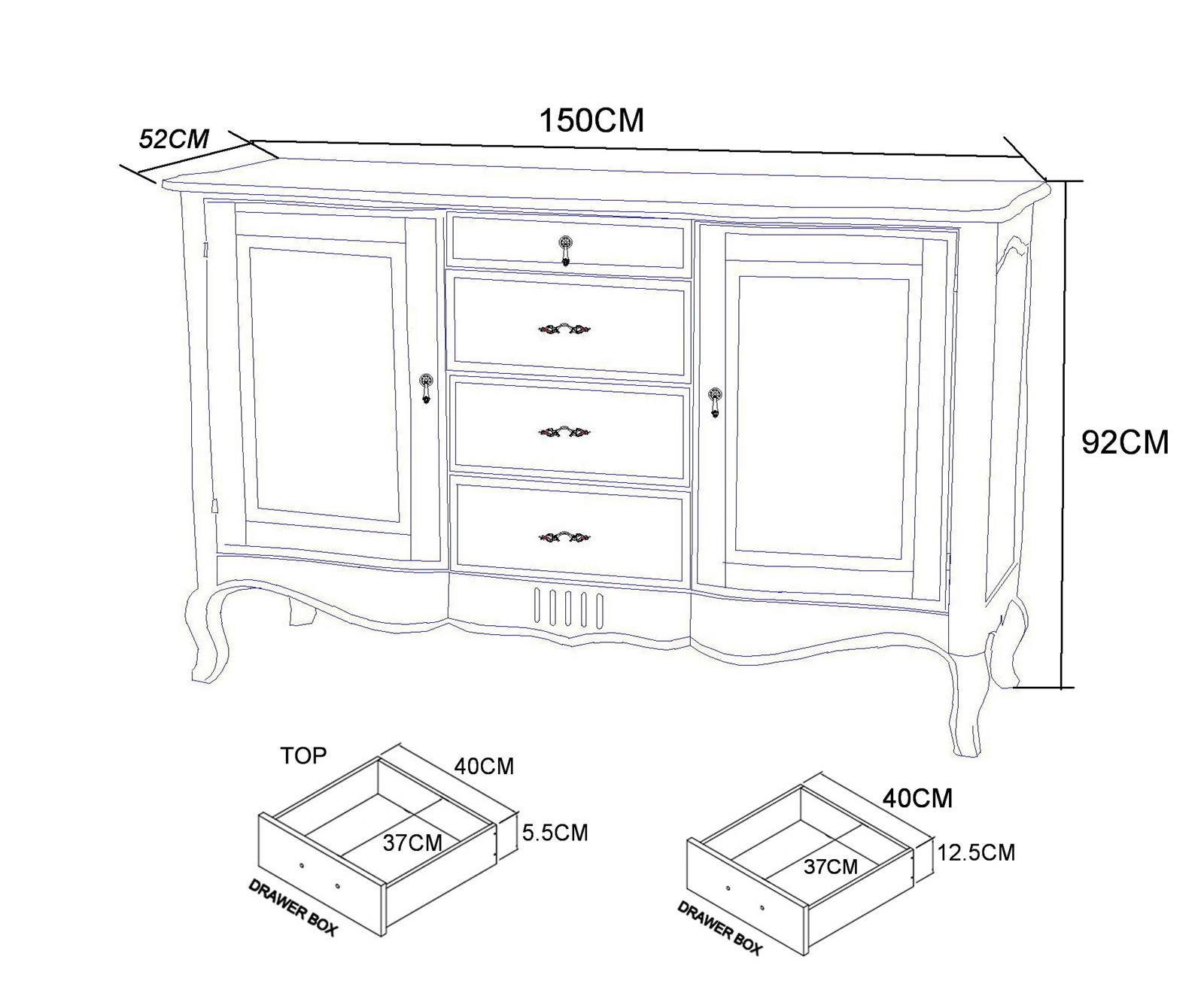 Produkt charakteryzuje się przestronnymi wymiarami: szerokość 150 cm, głębokość 52 cm oraz wysokość 92 cm. Komoda została wyposażona w 2 drzwi, 4 szuflady oraz 2 półki, które zapewniają dużą pojemność do przechowywania różnorodnych przedmiotów — od dokumentów i drobiazgów, po zastawę stołową czy tekstylia. Szuflady o różnych wymiarach (od 5,5 do 12,5 cm wysokości) umożliwiają organizację rzeczy o odmiennych rozmiarach, co wpływa na lepsze wykorzystanie przestrzeni.