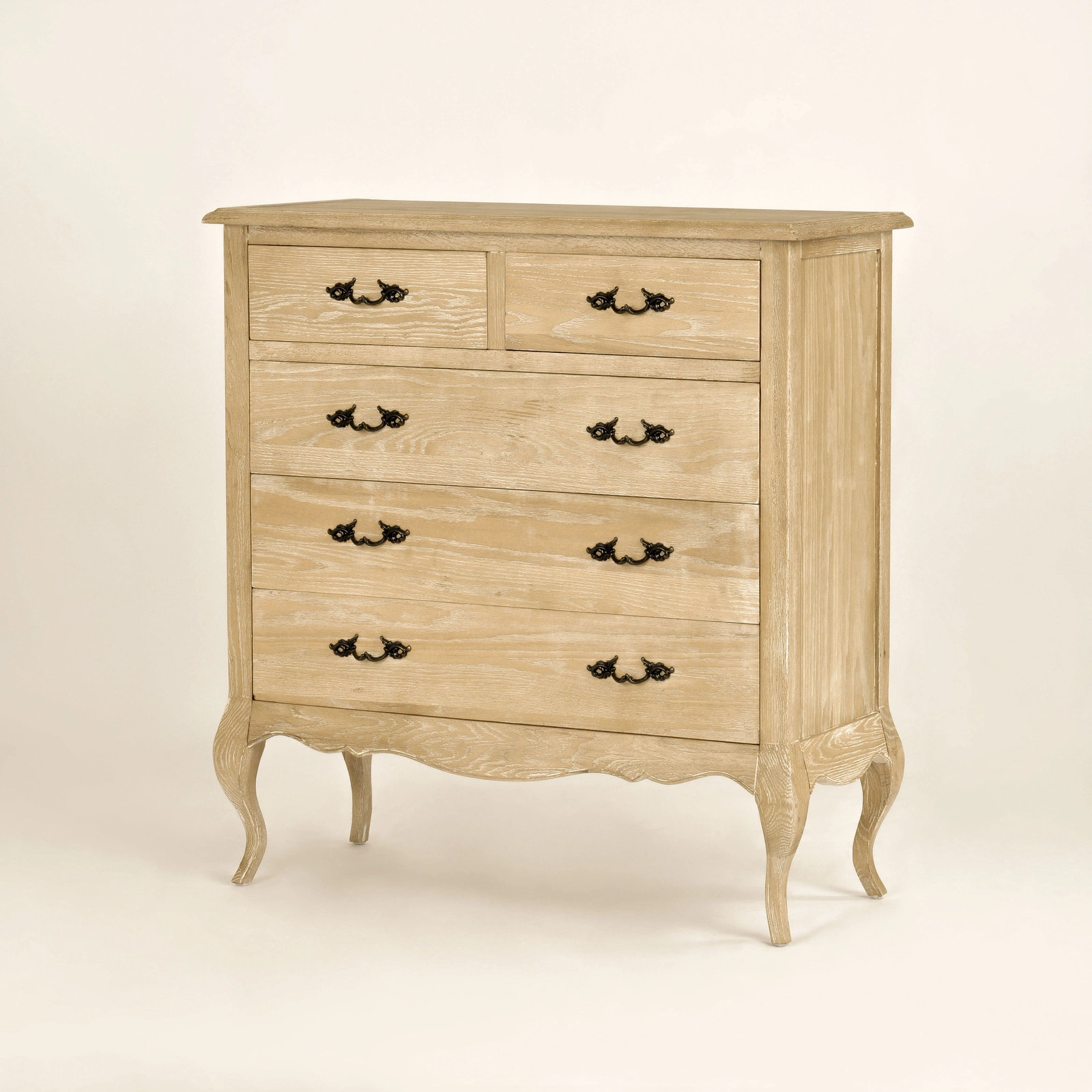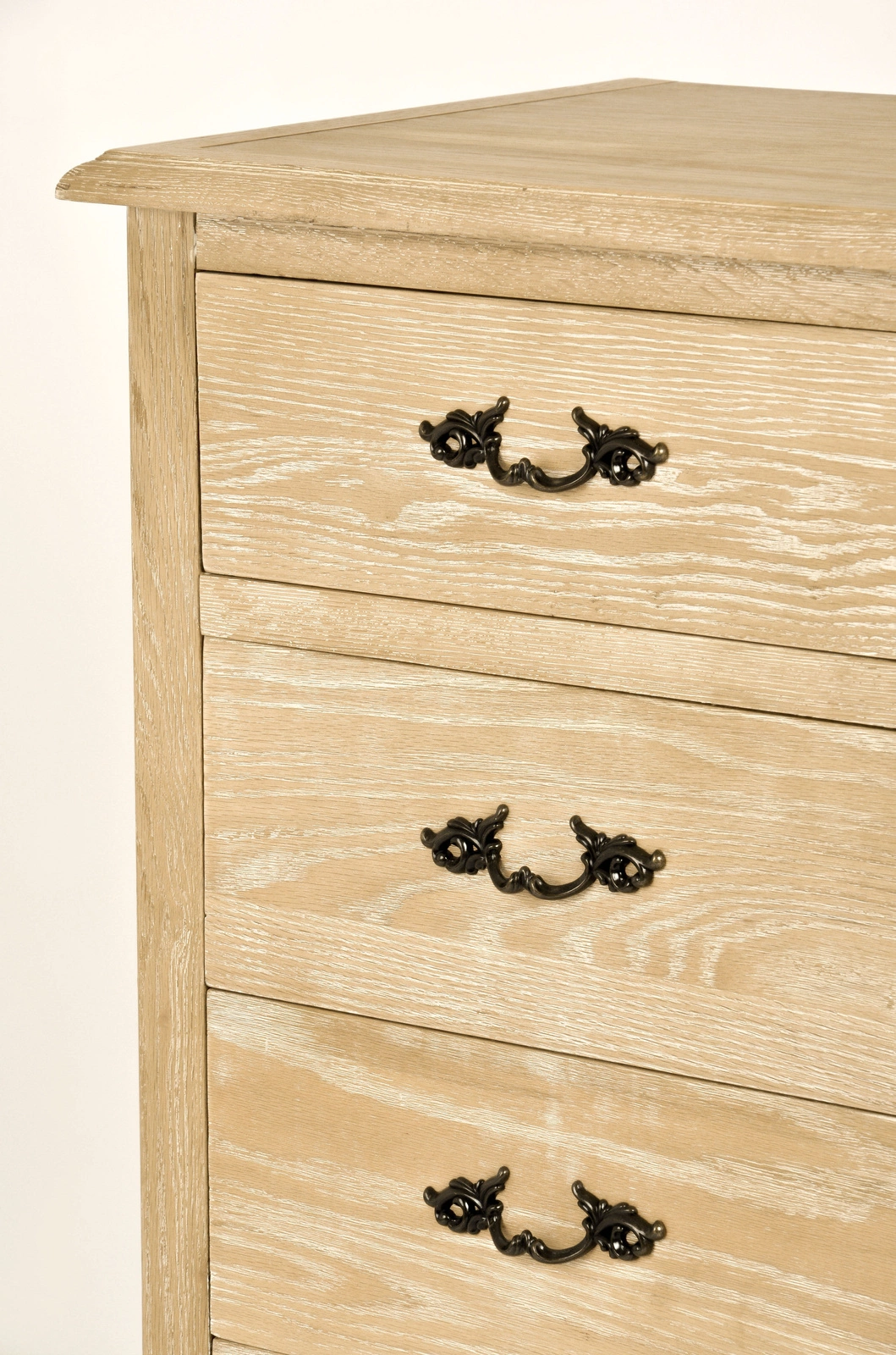 Unikalny charakter komody podkreślają jej detale: gięte nogi, ozdobne metalowe uchwyty oraz delikatne przetarcia w stylu shabby chic. Szczotkowana powierzchnia nadaje meblowi naturalny sznyt i miękkość dotyku, dzięki czemu doskonale wpisuje się w aranżacje klasyczne, rustykalne, a także nowoczesne wnętrza o ciepłym charakterze. Komoda w kolorze naturalnego jasnego drewna świetnie komponuje się z różnorodnymi odcieniami ścian i podłóg, dając dużo możliwości aranżacyjnych.