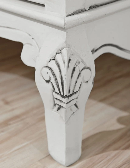 Rimini White RIW04 imponuje dopracowanymi detalami, szczególnie naturalnym, bielonym fornirem z uwidocznionymi sękami, które nadają meblowi ciepły, rustykalny charakter. Ciemnobrązowy blat doskonale kontrastuje z białą podstawą, dzięki czemu witryna staje się stylowym akcentem każdego wnętrza. Takie połączenie kolorów i faktur sprawia, że mebel jest nie tylko funkcjonalny, ale także wyrazisty i wyjątkowy.