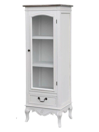 Witryna wyposażona jest w jedne szklane drzwi otwierane w prawo oraz jedną szufladę z metalowymi uchwytami, które wyróżniają się solidnością i wygodą użytkowania. Dwie półki ukryte za drzwiami zapewniają wystarczająco dużo miejsca na ekspozycję ulubionych dekoracji, książek czy porcelany. Drewniane prowadnice szuflady podkreślają naturalny charakter mebla i dodają mu dodatkowego uroku. Ten model to idealne rozwiązanie zarówno do salonu, jadalni, jak i gabinetu.